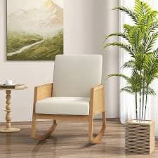 Rocking Chair With Rattan Armrests And Upholstered Cushion-Beige