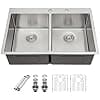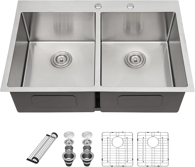 Premium 16-Gauge 304 Stainless Steel Construction: Crafted with heavy-duty 16-gauge 304 stainless steel, Sarlai double bowl kitchen sink delivers exceptional durability and corrosion resistance. The brushed finish ensures a sleek, modern look while hiding scratches and water spots. Ideal for daily heavy use, this stainless steel kitchen sink withstands stains, heat, and dents, making it a long-lasting upgrade for any kitchen. User-Friendly Safety & Maintenance Features: Features smooth rounded corners for safer handling and simplified cleaning. The scratch-resistant brushed surface repels stains and minimizes maintenance - simply wipe with mild soap. Reinforced sound-dampening pads underneath reduce noise from water impact, making this stainless steel kitchen sink both practical and peaceful. Smart 50/50 Double Bowl Design: Maximize kitchen efficiency with our spacious 33"x22"x10" double sink configuration. The balanced 50/50 split allows simultaneous food prep and dishwashing, while the extra-deep 10" bowls accommodate large cookware. Ideal for busy households needing a functional double kitchen sink with generous workspace. Sarlai Double Bowl Drop In Sink: Exterior size is 33Wx22Dx10H(minimum cabinet base is 36"), drain opening 3.5" as standard available for garbage disposal unit. Accessories of bottom rinse grid for prevent scratching, roll up rack for drying, and 2 x bottom grid,2 x drain strainer,1 x roll up drying rack. After-sale Service: Rest assured with our offering. Enjoy 3 months of returns. Buy with confidence and reach out to us with any questions or concerns about the product. Your satisfaction is our priority.