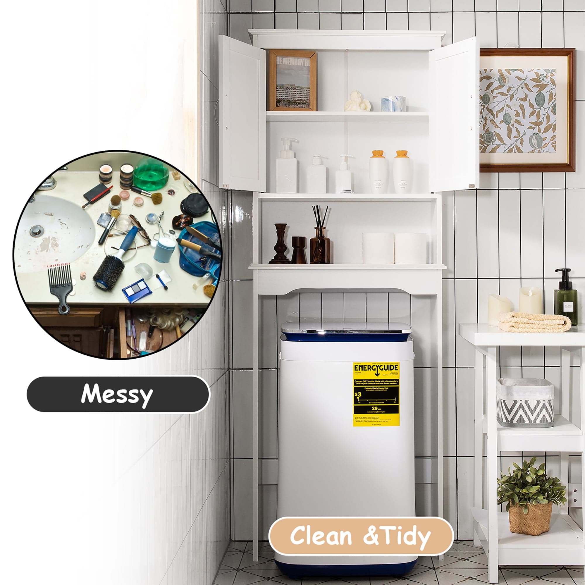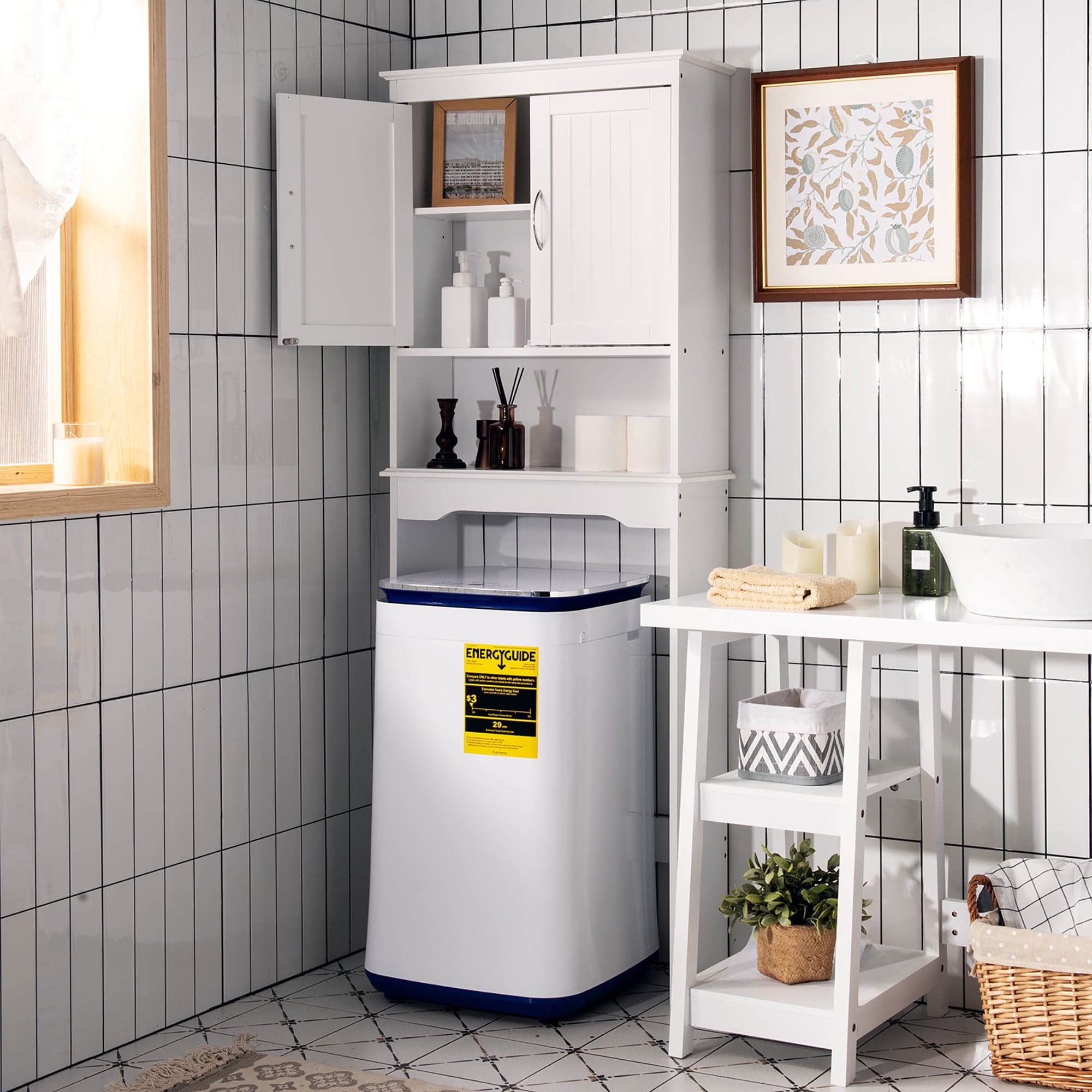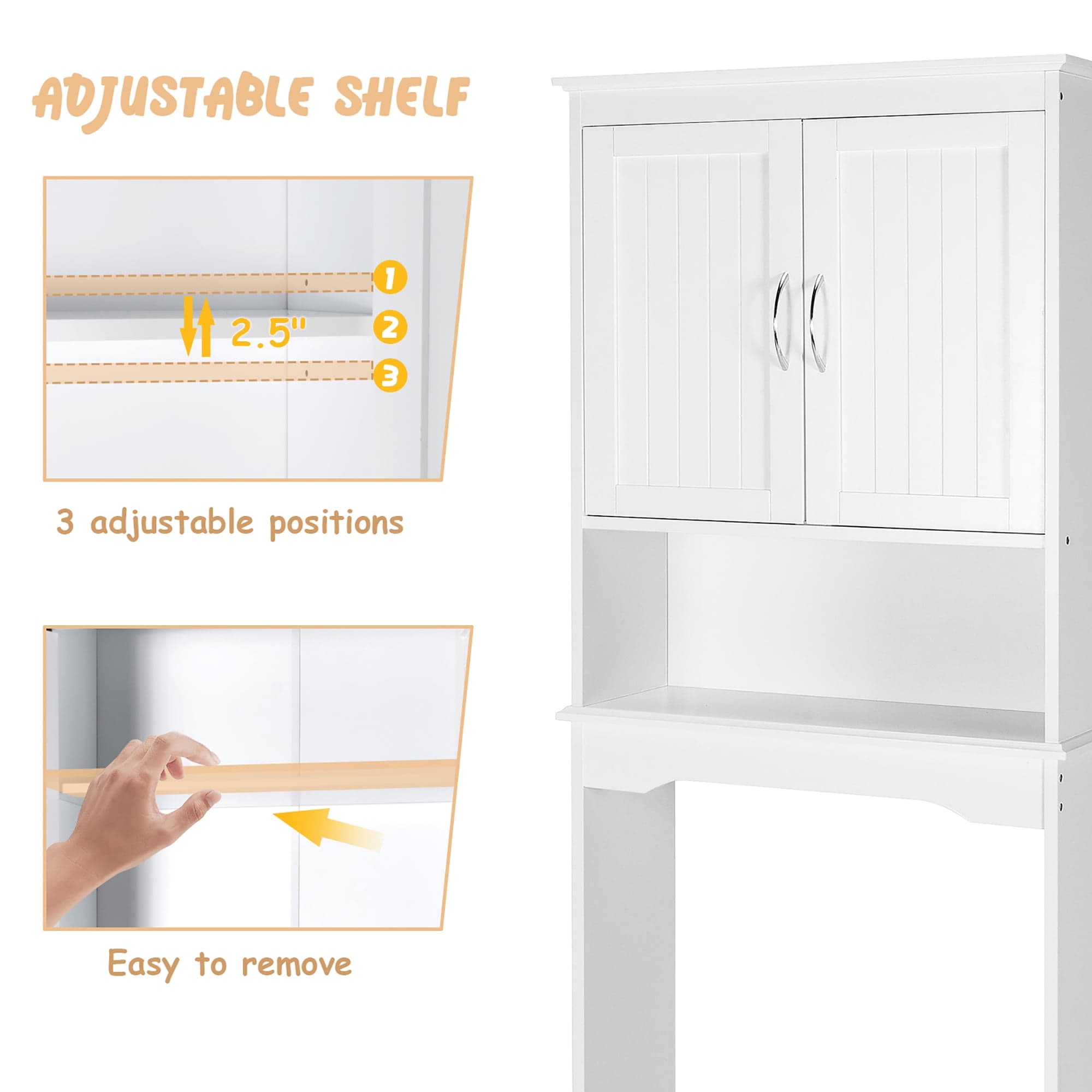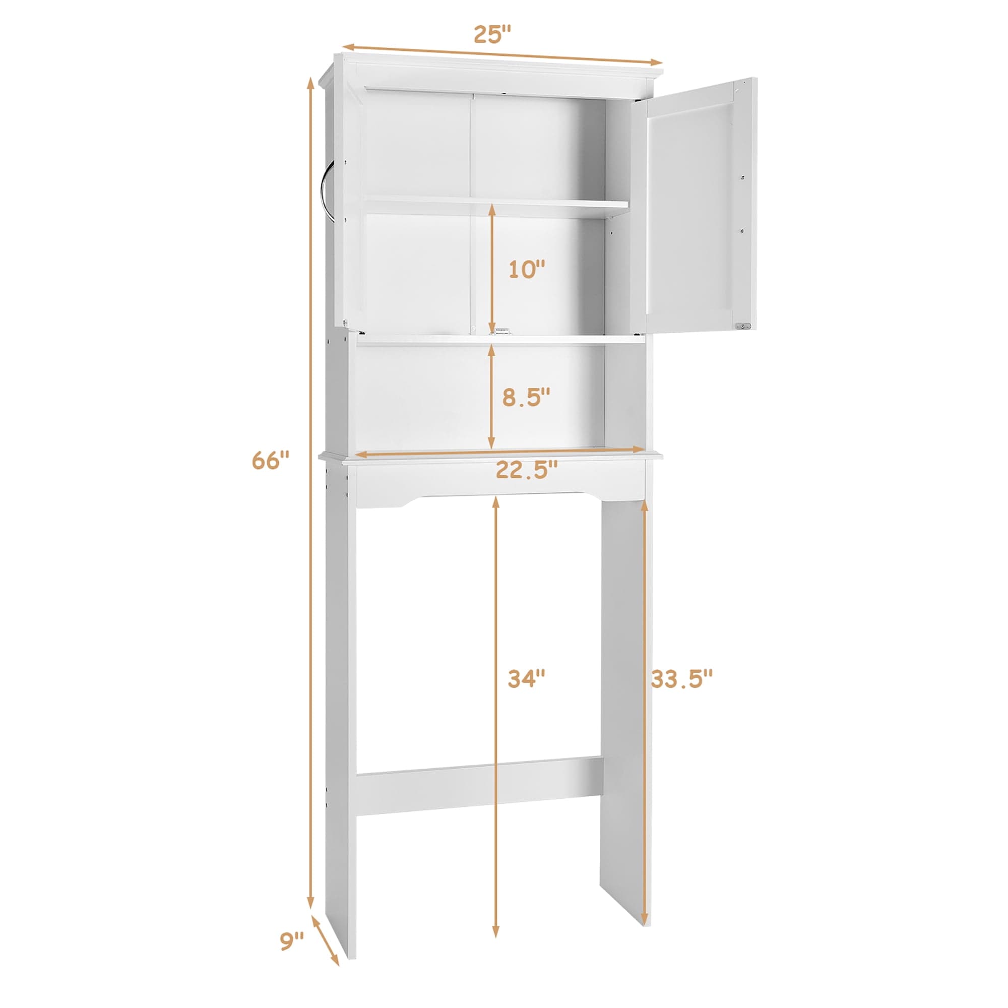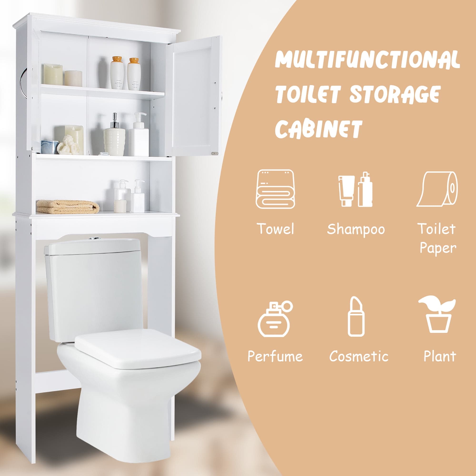 Optimize your bathroom space with Costway Over The Toilet Organizer in White. Features a storage cabinet and shelf!