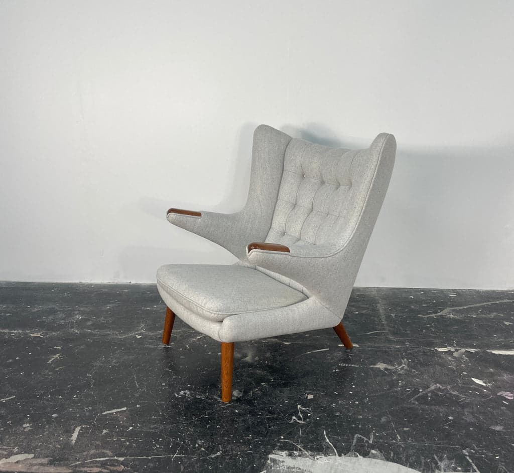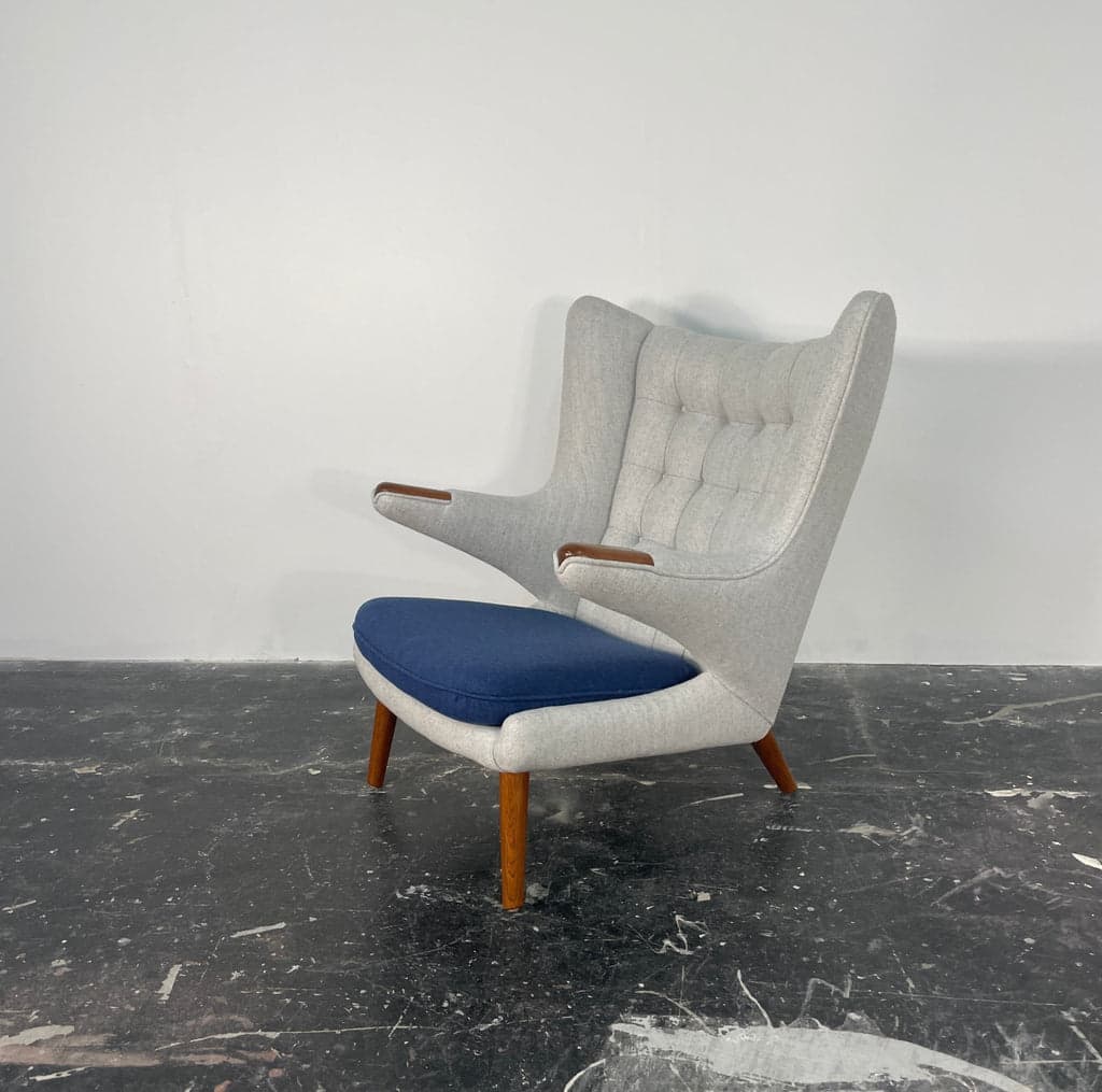 Vintage Hans Wegner Papa Bear Chair, arguably the most sought after mid century chair, and for good reason as it is supremely comfortable and built to last. The iconic Papa Bear chair is restored to excellent vintage condition. A truly iconic chair, newly upholstered in grey Maharam wool. The chair features beautiful oak legs and teak paws. We have created alternative cushions of green and blue for those who believe a change is as good as a holiday. You will receive all three when you purchase. These chairs, while created during the Mid century modern era, are timeless, iconic pieces of functional art that would look incredible in almost any contemporary environment. They would effortlessly blend into modern, regency and even traditional decor. The Papa Bear Chair, also known as the Teddy Bear Chair, was designed by Hans Wegner in 1951. The chair is named for its large, welcoming form, which is reminiscent of a bear's embrace. The Papa Bear Chair is characterized by its curved backrest, which extends up and around the sides of the chair to create armrests that are both comfortable and supportive. The chair's seat is also curved and angled slightly downward, creating a comfortable and relaxed sitting position.