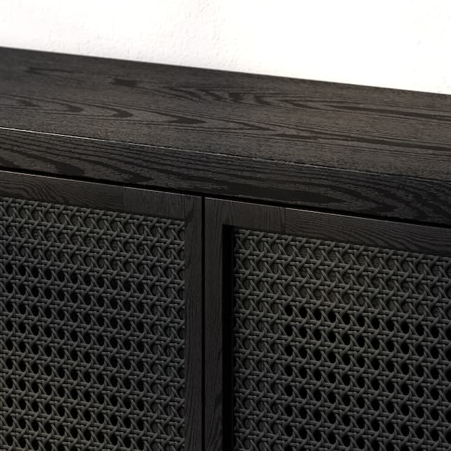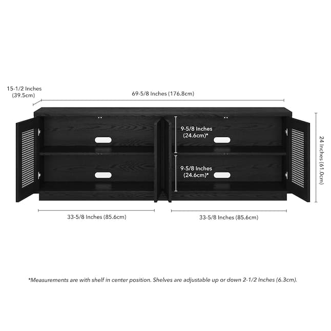 Combine functionality and eclectic modern design with this mid-century-inspired TV stand. Its rich wood tone creates a warm neutral palette that will blend seamlessly into any color scheme, while its subtly bohemian retro styling pairs perfectly with the existing design inspiration of your living room, den, or game room. This solid-backed stand features two large enclosed cabinets behind two-tone doors, featuring faux rattan inset detailing. Cable management cut-outs and adjustable inner shelves help keep your media storage and consoles organized, while leveling feet and adjustable hinges ensure everything sits just right.