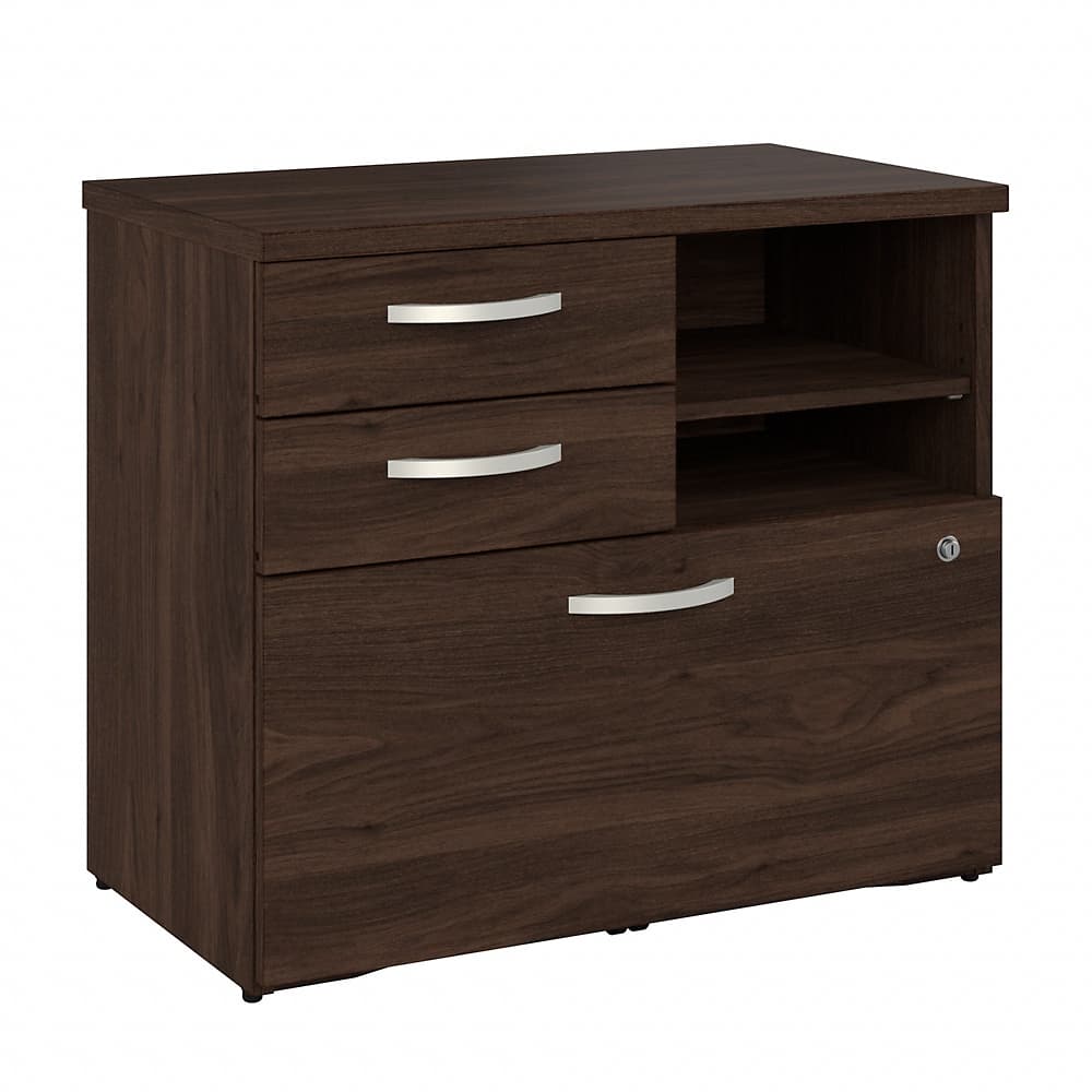 Bush Business Furniture Hybrid Office Storage Cabinet offers a long-term organizational solution for professionals. It keeps your documents, supplies, and equipment easily accessible. The file drawer has smooth full-extension ball bearing slides and locks to protect sensitive paperwork. Two box drawers are perfect for organizing smaller supplies, while open shelves hold frequently used items. Designed for stability, it includes hardware to anchor it to a wall. Made in America with both U.S. and imported parts, this cabinet is tested to meet high safety and performance standards.