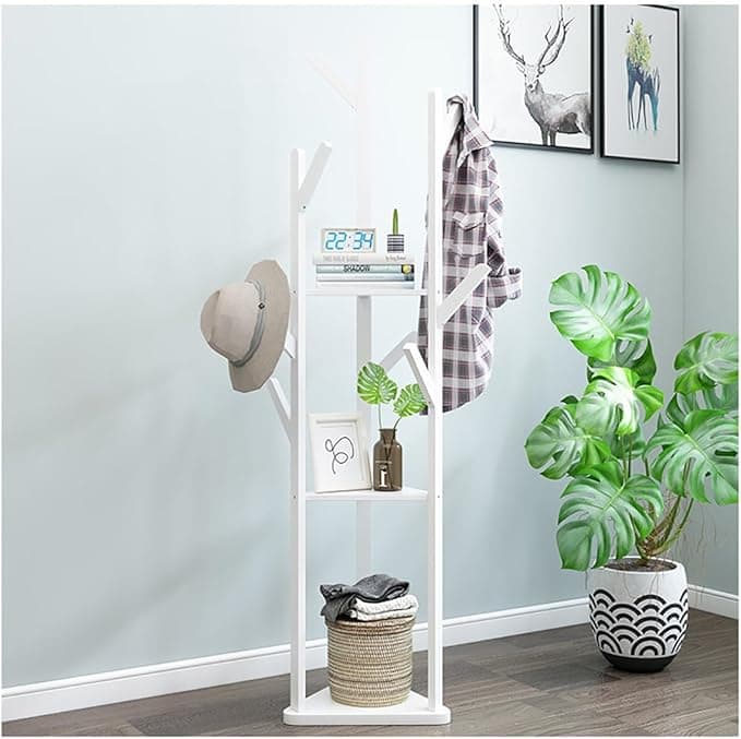 KDFWYDS Wooden Garment Rack With 3 Shelves Freestanding Clothes Rack With 8 Side Hooks Coat Rack With Triangle Base For Entryway And Bedroom (Color : White, Size : 35x163cm)