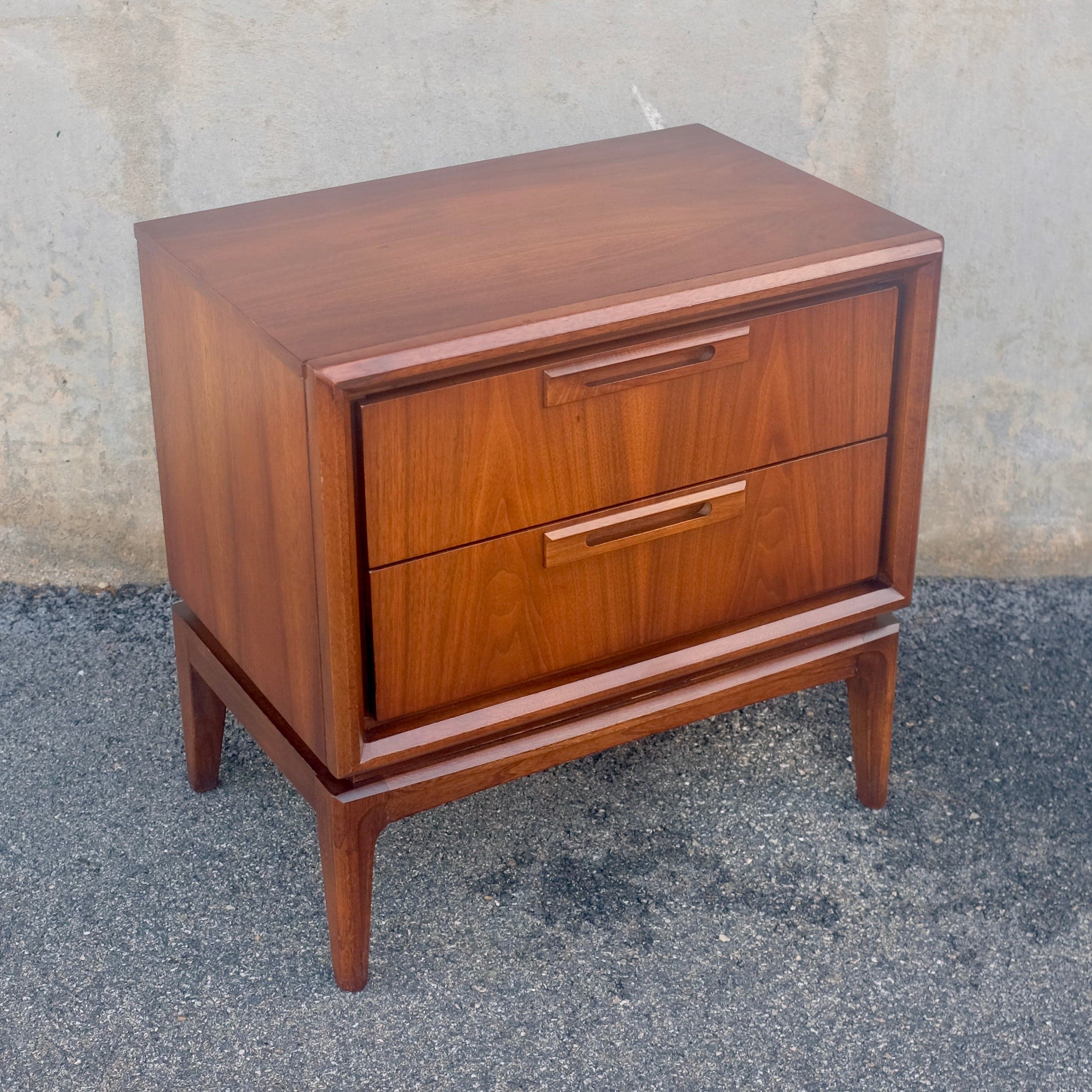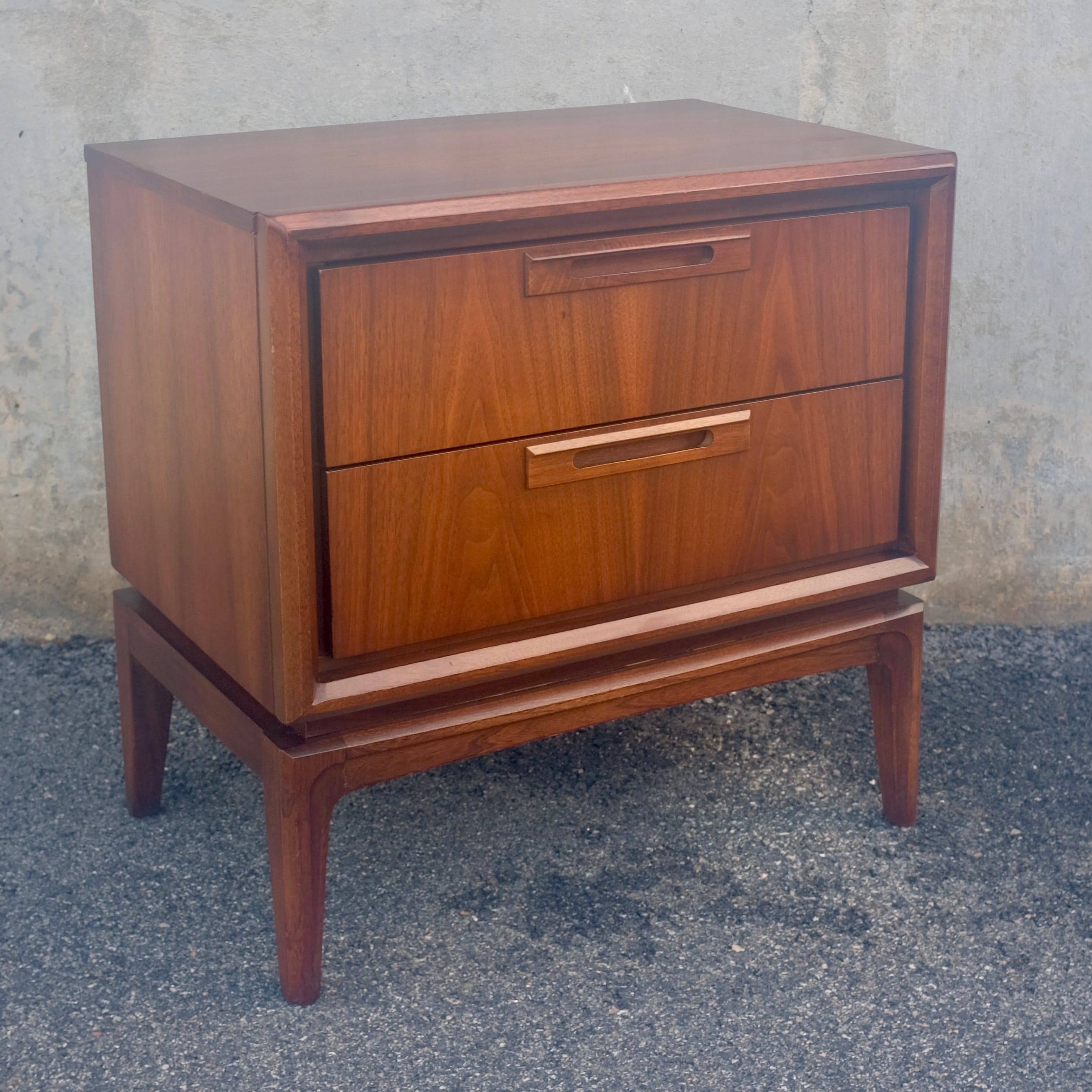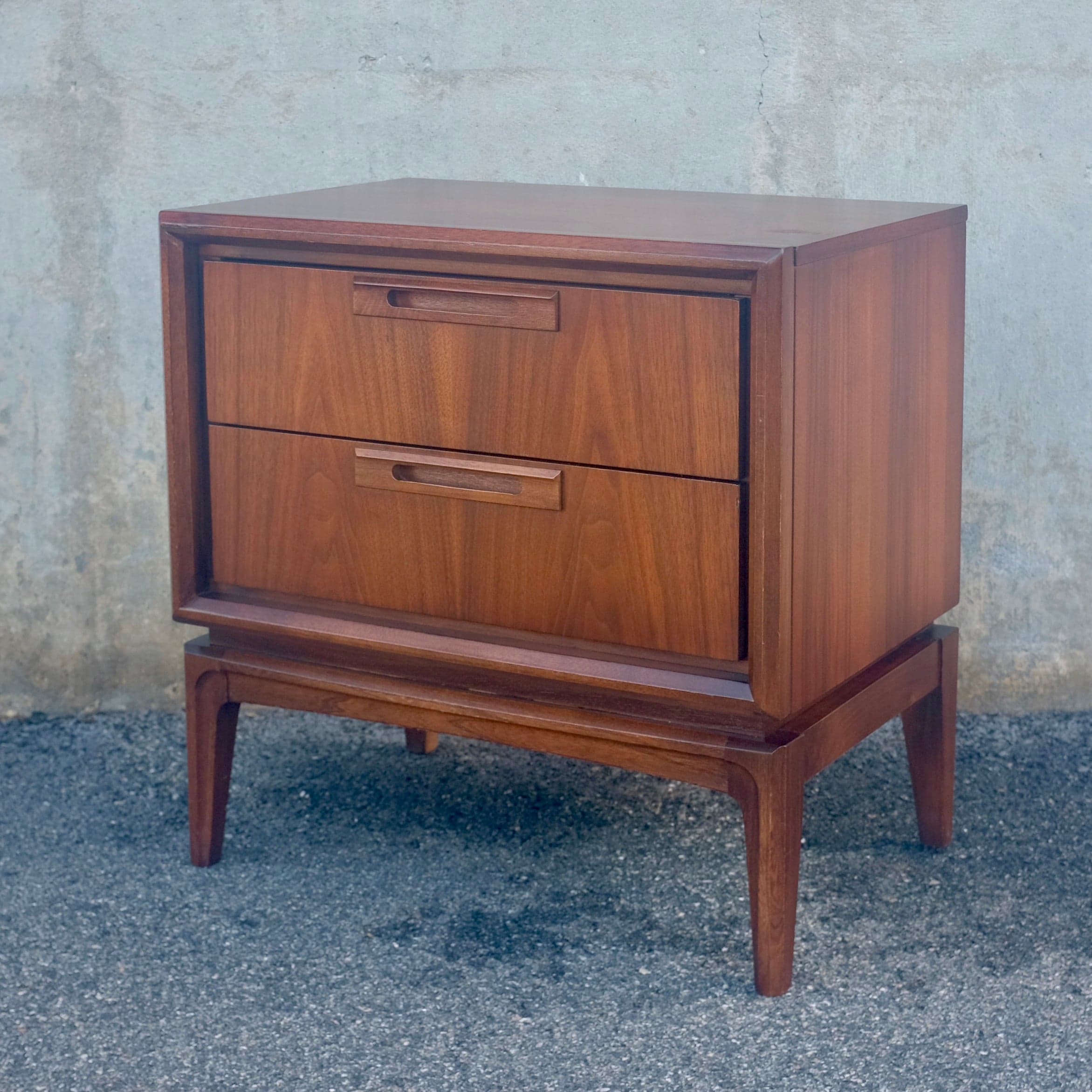 This United Furniture walnut nightstand is from their “Discovery” collection. Two drawers with sculpted wooden recessed handles, tapered legs, and gorgeous grain that flows from one drawer front to the next. Professionally restored. This piece has been professionally restored, but like all vintage pieces, does show signs of wear due to prior use. From an original advertisement: "A bold new contemporary design. Discover the craftsman’s light touch - the special beauty of Discovery by United. You can see it in the drawer pulls, each an individually handcrafted work of art. You can feel it in the superbly sculptured cabinet frames, in the carefully selected, high quality walnut veneers. Fresh lines, subtle detailing, supreme craftsmanship . . . all come together beautifully in bedrooms, studios, dining, and living rooms from the Discovery collection by United." Shipping Information - Please contact us for a quote on shipping. We have input the "average" price for a larger item, but usually, smaller items such as headboards or nightstands will cost considerably less to ship. Our apologies for the difficulty; it is the nature of dealing in vintage furniture and pieces of all shapes & sizes. Note Regarding Condition: The furniture pieces we sell are all professionally restored, but they are primarily from the 1950s & 1960s; many will show signs of wear due to prior normal use. If there is any significant or noticeable damage, it will be noted in the product description above.