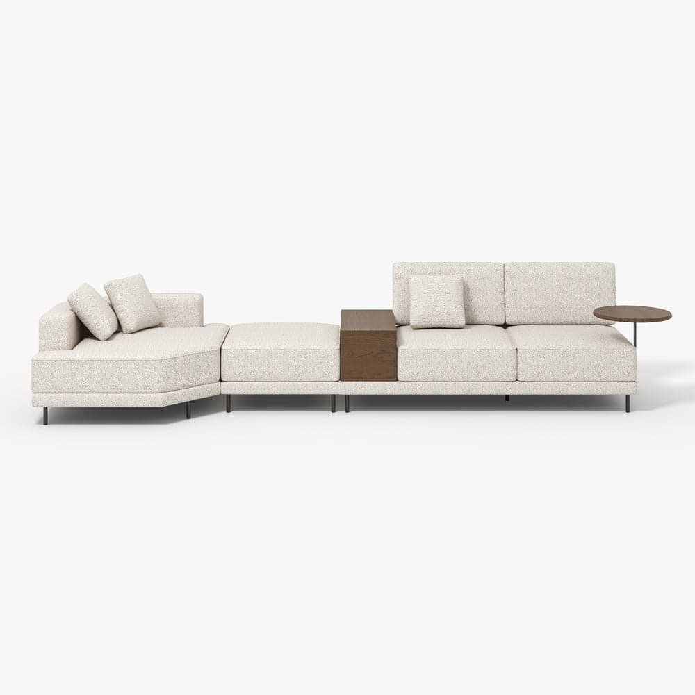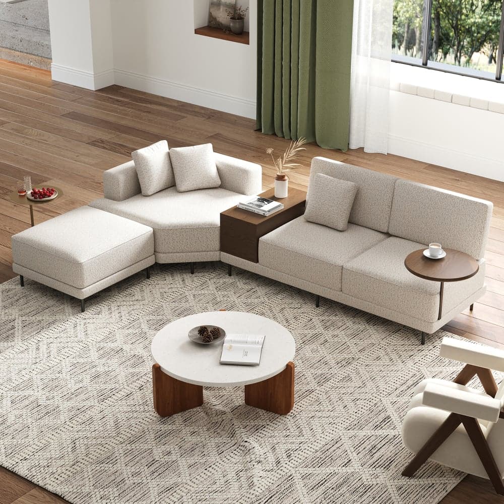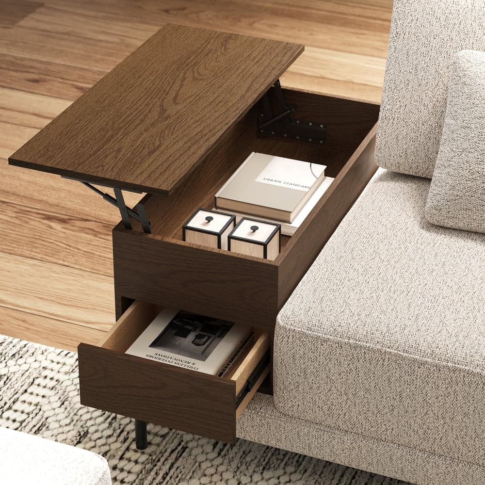 Sink into the plush embrace of our soft, breathable boucle, featuring a natural texture that ensures lasting comfort. Elevate your leisure moments with the convenient lift-top table, perfect for storing magazines and essentials, while the swivel tray keeps your drinks and snacks within easy reach. Modular design offers the ultimate in flexibility and adaptability. Tray and lift top table offers daily storage solutions. Breathable boucle exudes texture.
