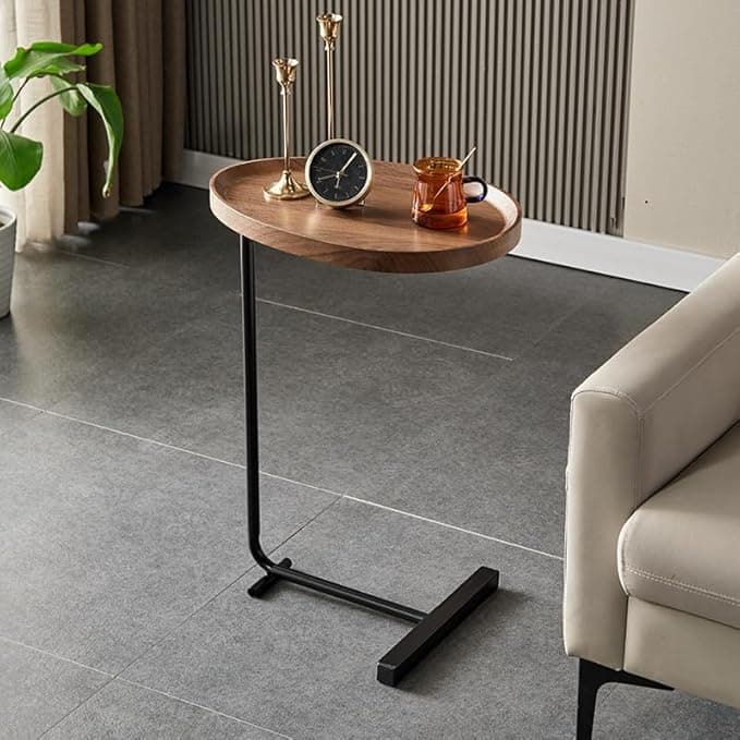 Specification: Product material: metal + walnut; Product size: 11.8"L17.7"W27.5"H; Product Weight: 6lbs; Max. Static Load Capacity: 20 lbs. Details: Curved desktop, smooth and delicate; Waterproof desktop, easy to clean; High-quality wrought iron table frame, stable and durable; The C-shaped design, this end table can easily hug the side of your sofa or chair. Save space.