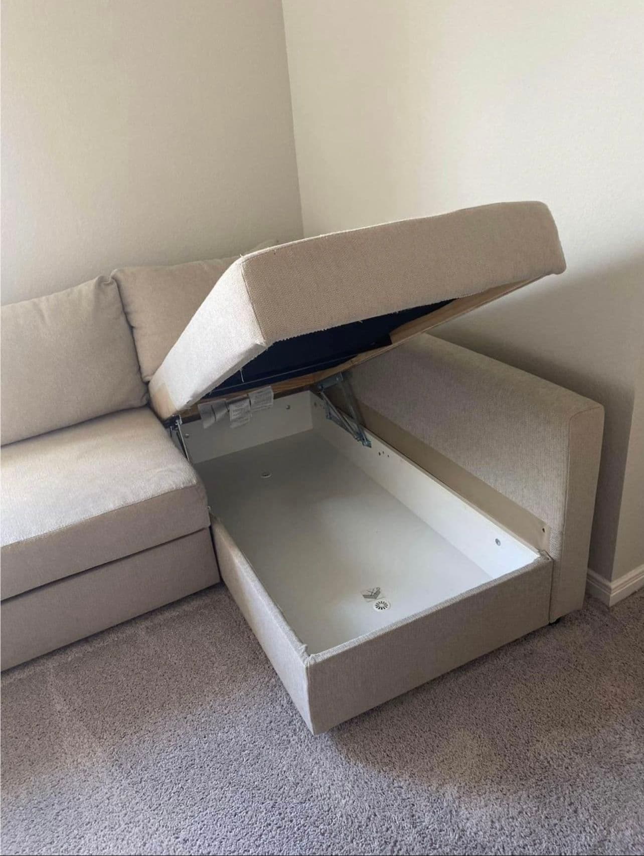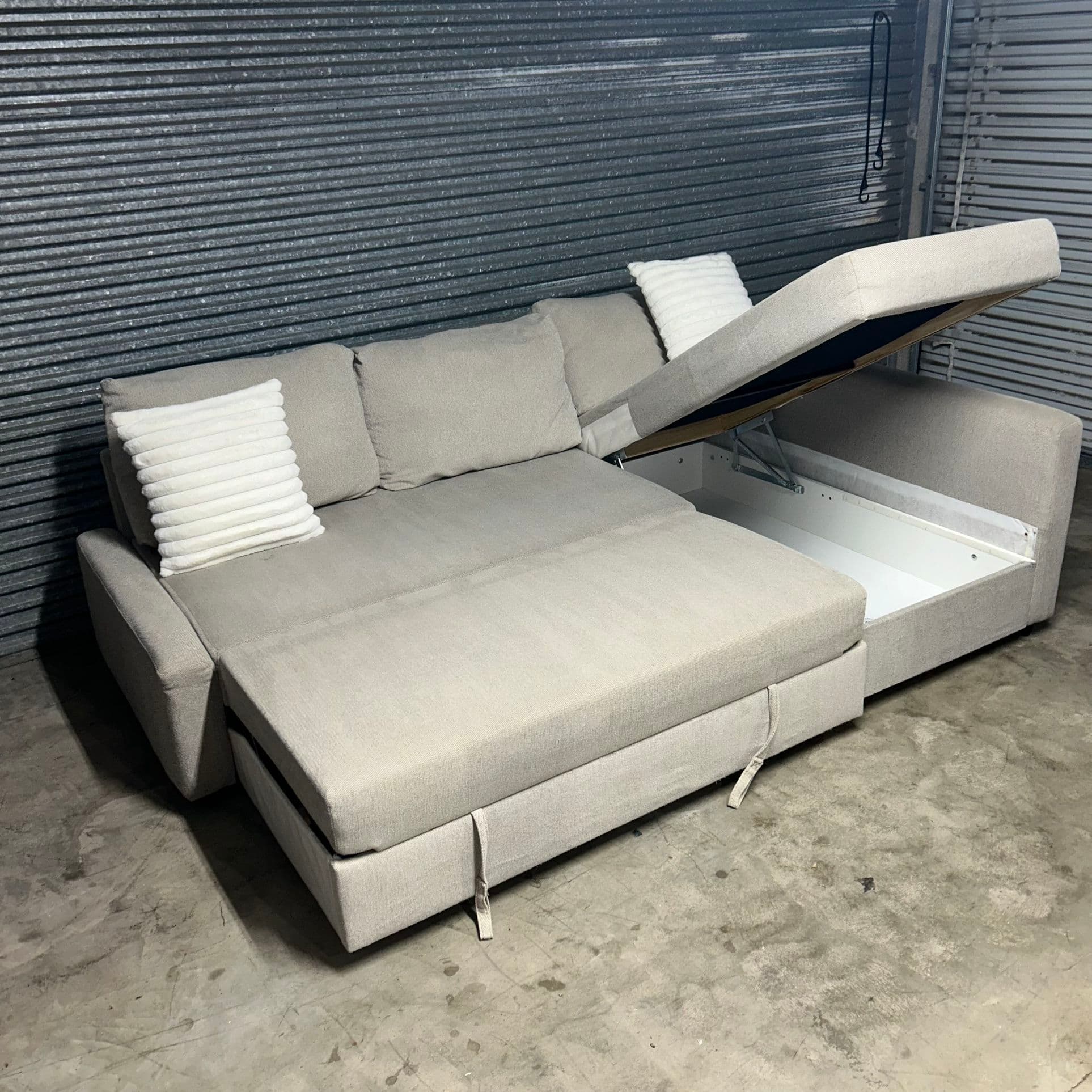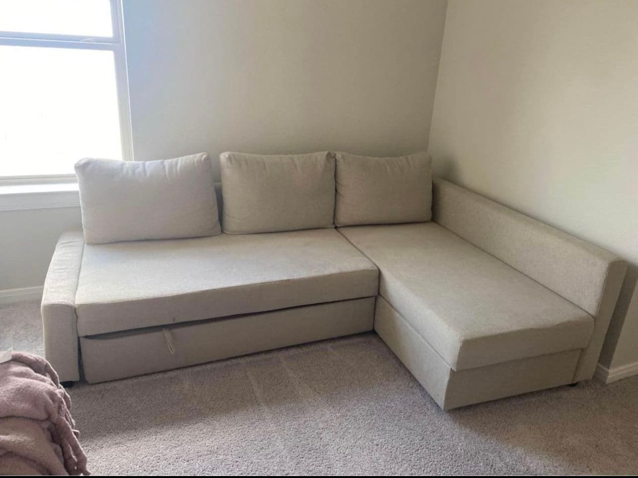 Reconditioned/Certified, Beige IKEA Friheten sleeper sofa with storage Smoke & pet free. It has a spot on the seat (see photos) overall in good condition. Couch has been cleaned and ready for a new home. White pillows are not included. Pick up from 77099 or I can deliver locally for $50. First come first serve. NO holds. Cash or Zelle only.