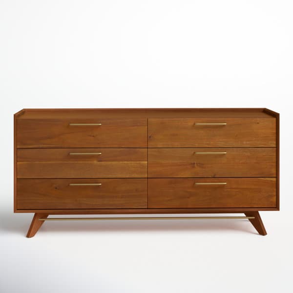 Mid-century simplicity. This 5-drawer double dresser blends retro-modern style with practical storage solutions. Constructed from solid acacia wood, it features a walnut finish that showcases its natural grain variations. The six drawers, equipped with English butt joints and ball-bearing glides, offer ample storage for your wardrobe essentials. We love that the expansive top has raised edges for keeping picture frames and a table lamp in place. Metal with a painted handles add a sophisticated finishing touch – plus, they're removable, allowing for personalization and customization.