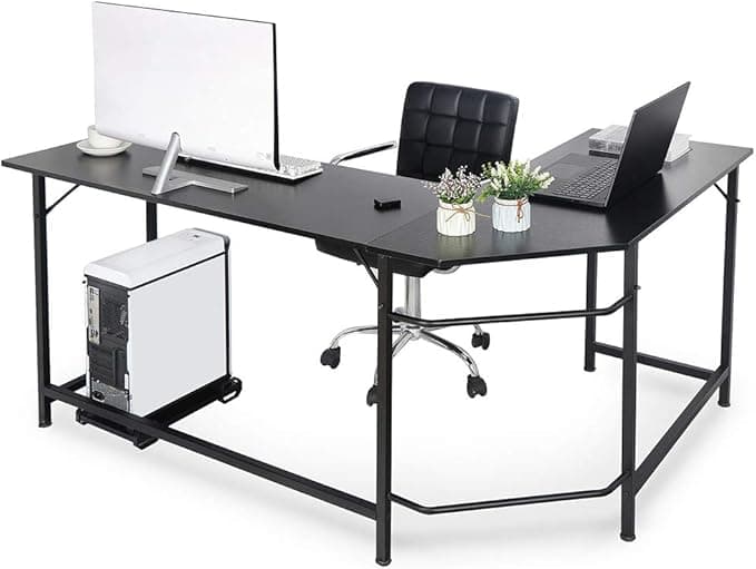 L-Shaped Computer Desk This desk Built from E1 class environment protection particial board with a strong steel e, this modern home office desk is built to last and is sturdy enough to hold all of your items. Compact l Style & Multifunction This computer desk comes in simplistic color, the color will be suit for any decor. The appearance is compact, simple and l. The table can be placed in your home study, bedroom and office to serve as a computer desk, office workstation, study stable, writing or gaming desk. Humanized Design Provides a surprisingly large amount of work area, perfect for limited space. Creative bevel angle design, perfect to storage your wire, farewell restraint. Humanized foot rest design, when you are tired at working, just have your leg on the steel bar and have a cup of coffee for rest! Installation & Easy to Clean This computer desk is need to be assembled by yourself. M-style buckle design, which makes it very easy to put it together with instructions, just connect it without any screw, fast and solid. Smooth metal and engineered wood is dust and water resistant and can be easily cleaned with a damp cloth. Protective Feet Pads The computer desk comes with Adjustable feet pads for different height need, uneven ground conditions (keep balance) and protect the floor from scratch. Bonus free CPU stand is provided, perfect for CPU storage won't scratch the floor. Safety round corner design for home use.