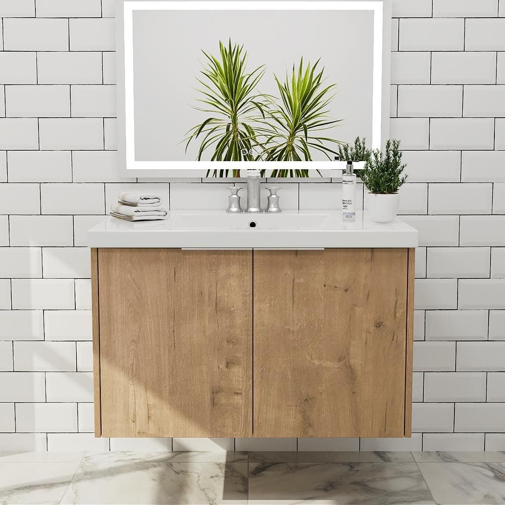 Pop up your vanity room with this BTCSTAR SUGUR Wall Mount Bath Vanity Cabinet with Sink in Oak with White Resin Sink and Top.