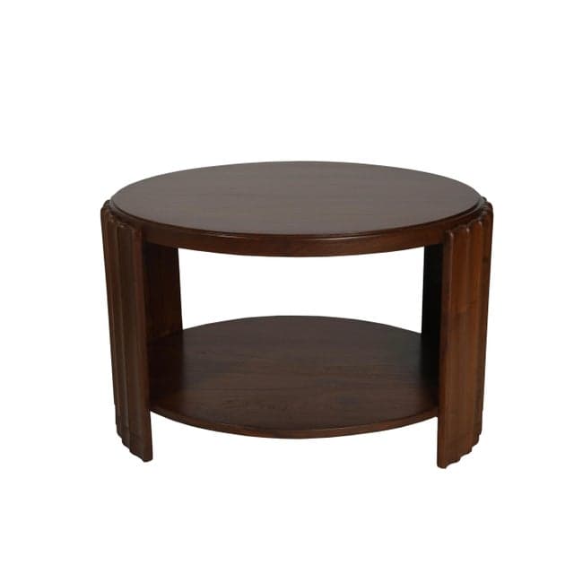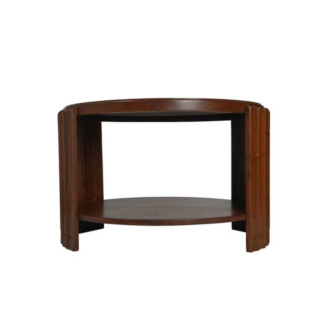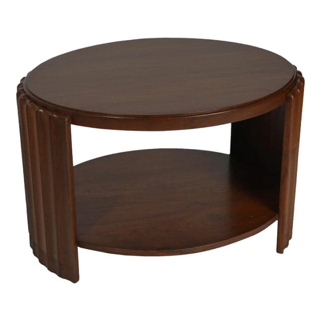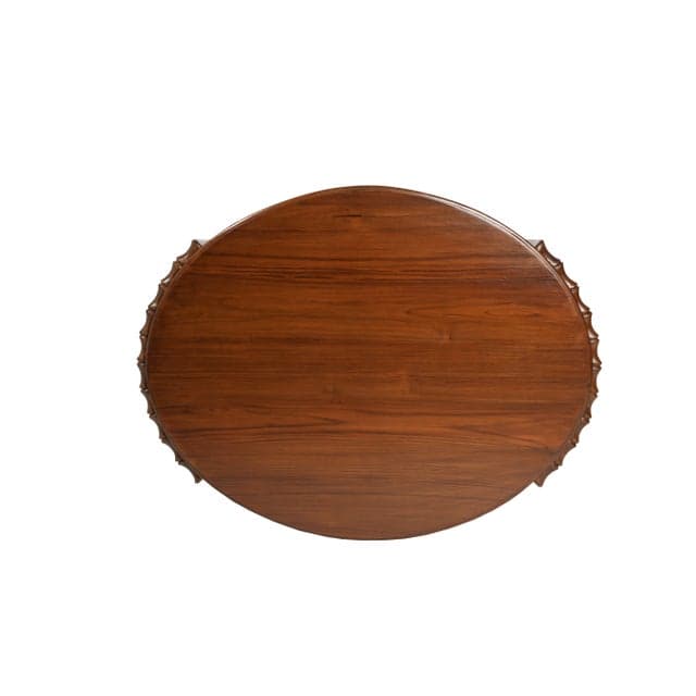 A simple and elegant Mid-Century Modern teak wood coffee table or side table. Features a lower shelf and carved, fluted sides. Nice oval shape. European, 1970's