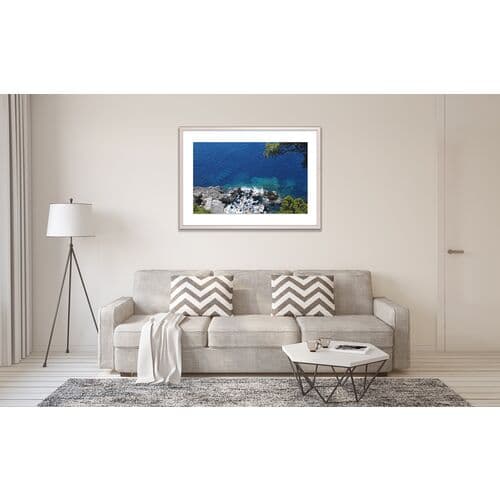 This photo by Natalie Obradovich offers a view of Italy's Amalfi Coast from above, focusing on the vibrant blue waters. The image is printed on semi-gloss photo paper and presented in a shadowbox frame, ready to hang. Natalie Obradovich, a travel photographer based in New York and Los Angeles, draws inspiration from her work in interior design, her travels, and her passion for the ocean. A USC graduate, her career includes working with notable names like Kelly Wearstler and Thad Hayes.