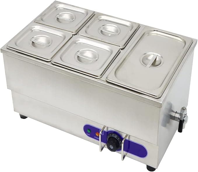 This Bain Marie steam table is made of food-grade stainless steel material, features uniform heating, non-toxic, non-polluting, rust-proof, corrosion-resistant. The thickened wall makes it not easy to deform and more durable. The temperature of this commercial soup warmer stove is adjustable, ranging from 122℉ to 176℉ (50℃ to 80℃). It has a large capacity with 5 pans, and each pan comes with a lid to help keep food warm.