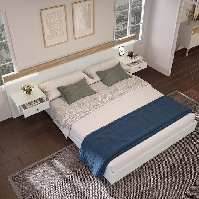 Ce cadre de lit double en bois est fabriqué à partir de matériaux de haute qualité pour une construction durable et solide. Le design flottant permet de fixer deux têtes de lit de chaque côté du lit, avec des veilleuses LED et des ports de chargement, ce qui le rend à la fois esthétique et pratique. Le design est simple et élégant, ce qui le rend adapté à tous les âges. Adapté à tous les styles de chambres à coucher, ce cadre de lit est capable de créer une atmosphère moderne et atmosphérique, ce qui en fait un excellent choix pour rehausser le goût de votre vie à la maison.