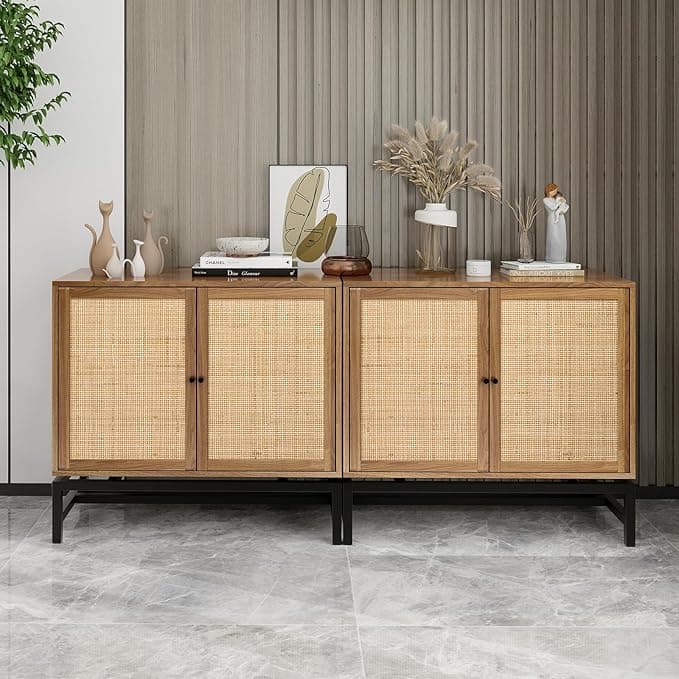 Set of 2 Rattan Buffet 2 Door Cabinet with Storage, with 1 Adjustable Inner Shelves, Accent Cabinet with Iron Framework Feet, Compatible with Living Room, Dining Room, Entry, Kitchen () Locker