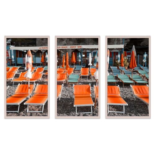 Created by Natalie Obradovich, this triptych captures the ambiance of an Amalfi Coast beach adorned with vibrant orange lounge chairs. The set includes three pieces printed on semi-gloss photo paper, showcased in shadowbox frames, and arrives ready for hanging. Natalie Obradovich, based in New York and Los Angeles, draws inspiration from her experiences in interior design and her travels, with a passion for oceanic themes. A USC graduate, she has worked with renowned decorators such as Kelly Wearstler in Los Angeles, and Thad Hayes and Neal Beckstedt in New York.