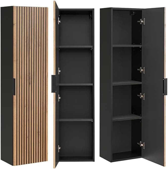 With this tall cabinet you bring distinctive style and clever order to your bathroom. The deep-drawn front in Wotan oak replica with black grooves meets a dark body? A design with strong effect. Inside adjustable shelves and soft-close comfort ensure peace and overview. The door hinge is freely selectable, the handles are matt black. An elegant storage miracle that makes your everyday life more beautiful.