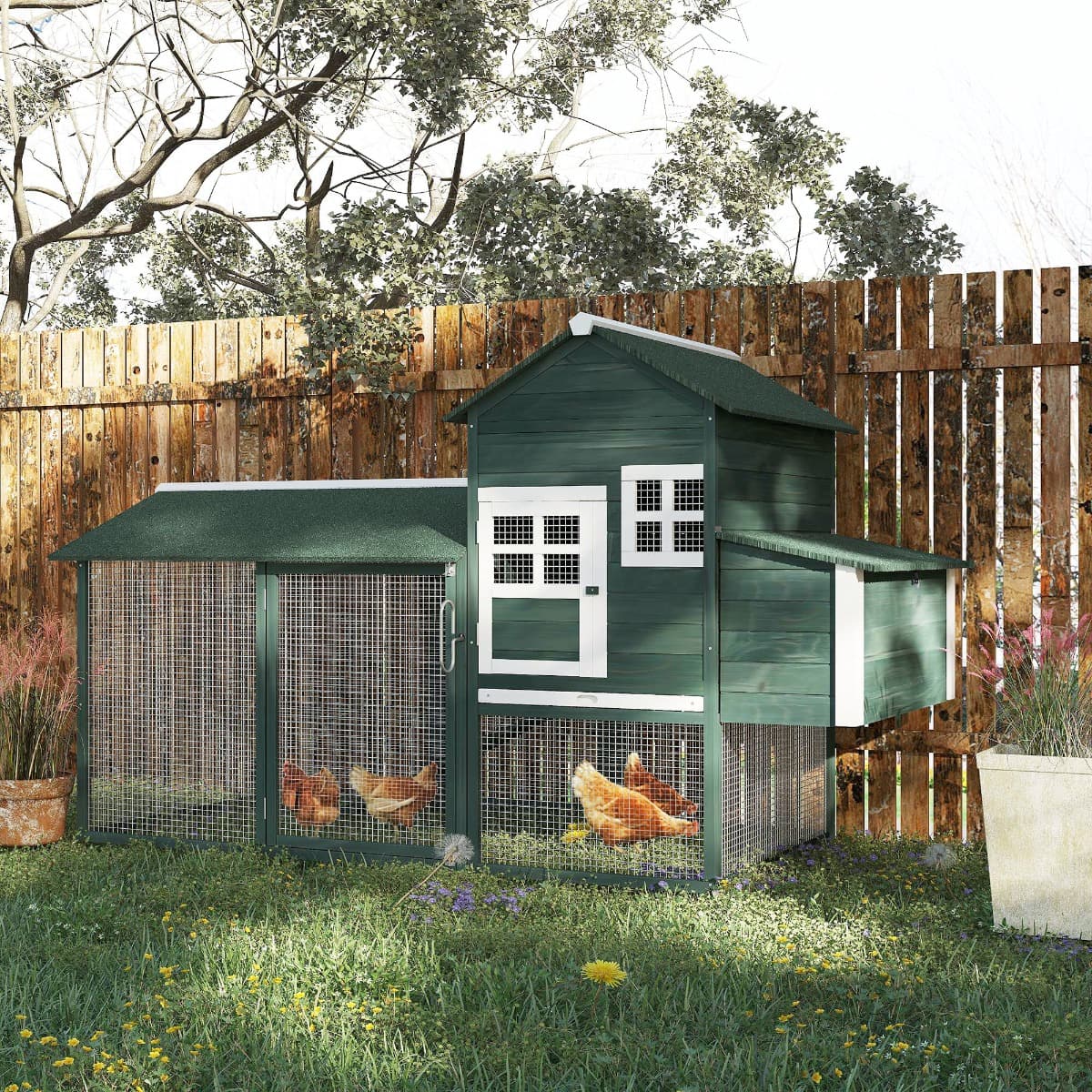 Constructed from high-quality Fir wood with a treated finish this outdoor chicken coop from PawHut is made to match your home and garden. A water-based paint gives a green finish to a chicken coop that has an expansive living area for your chickens. With the spacious indoor area and sizeable fenced outside area, your chickens own a series of options both to hide from the elements and to enjoy the sun. A variety of accommodating features including a 2-part chicken nesting box with a hinged top that offers an easy way to deposit and collect eggs perches inside for your chickens to roost on during the day or night a ramp for quick access to the inside and screened windows that allow for proper ventilation and airflow. Improve your backyard and the life of your chickens today with this lovely large chicken coop from PawHut.
