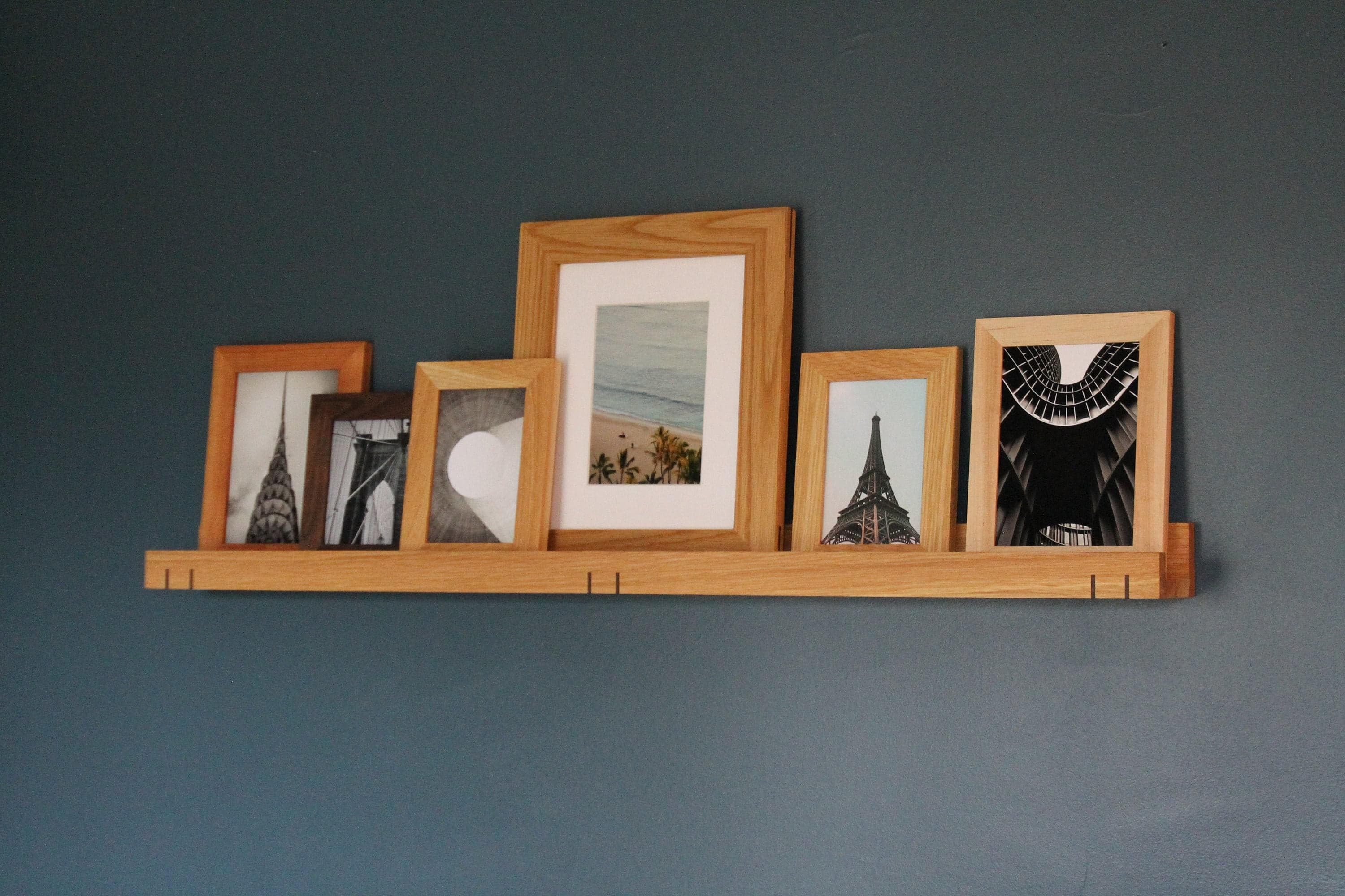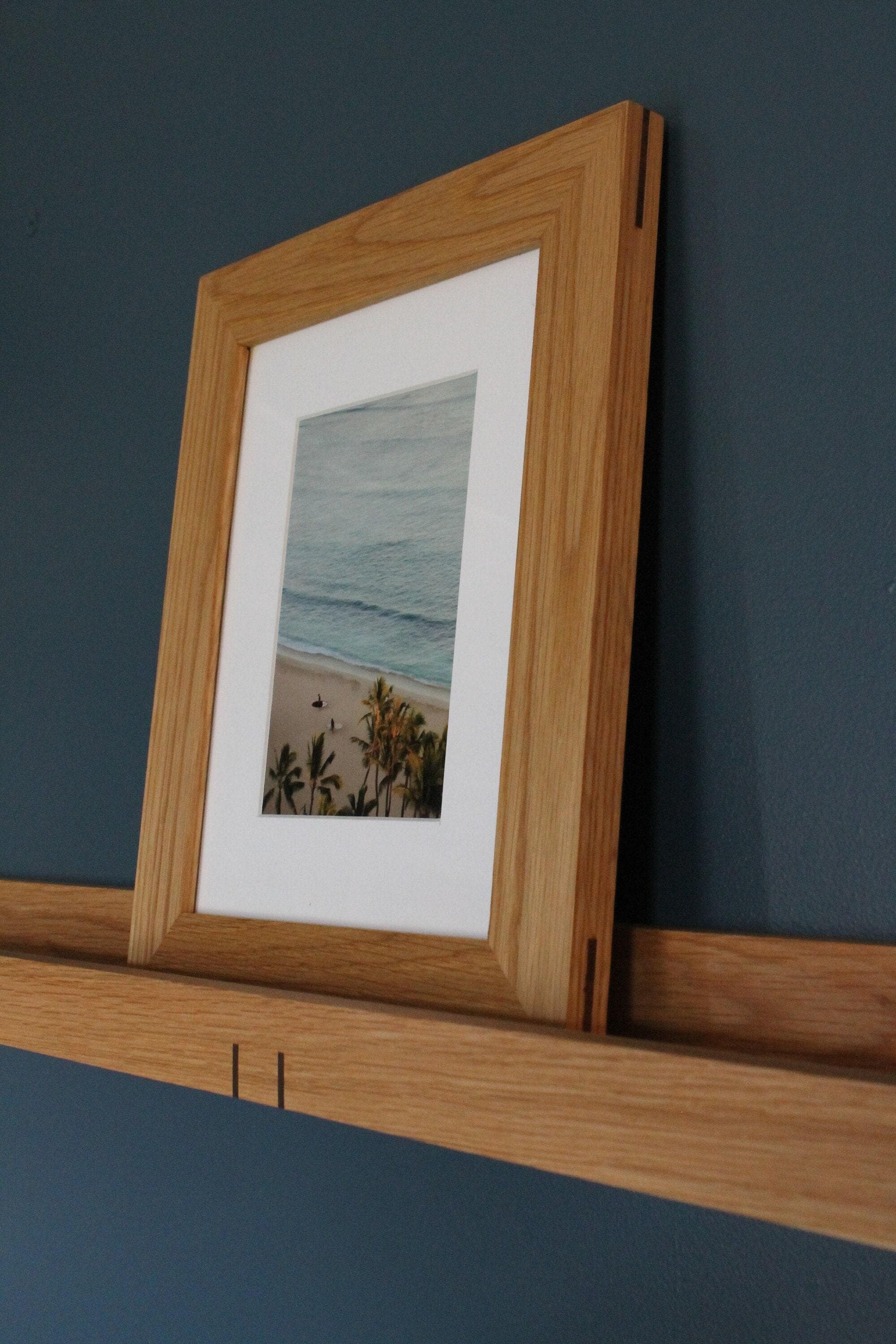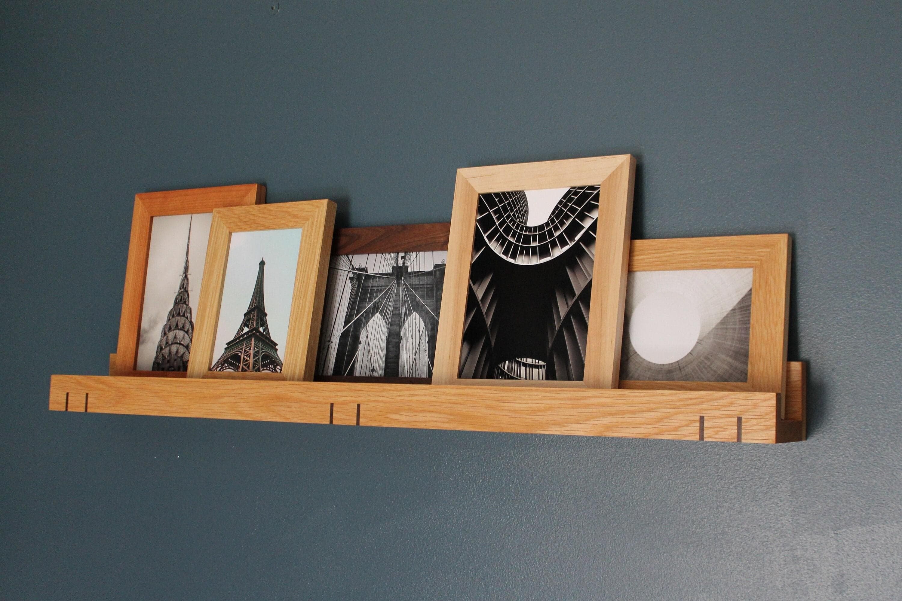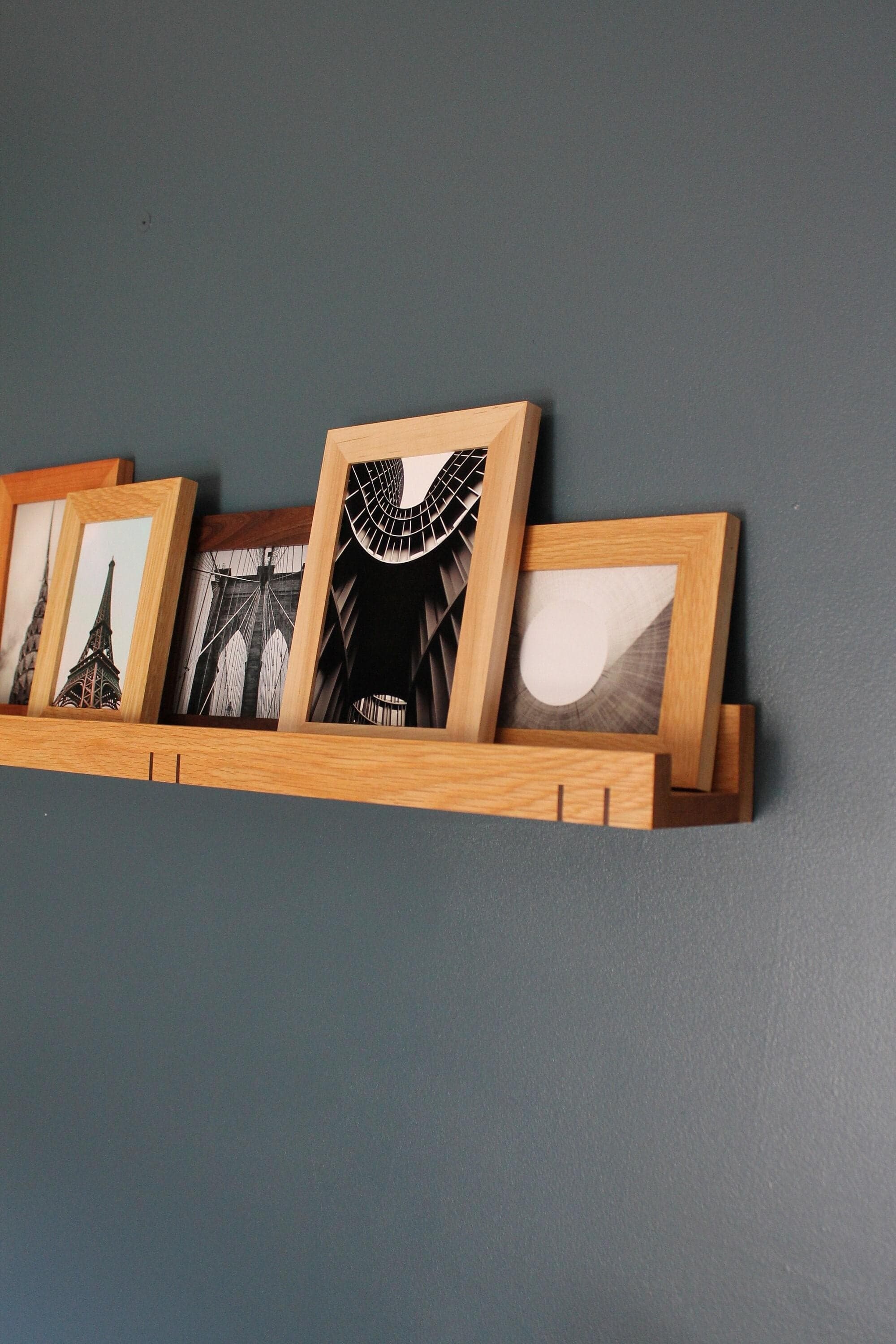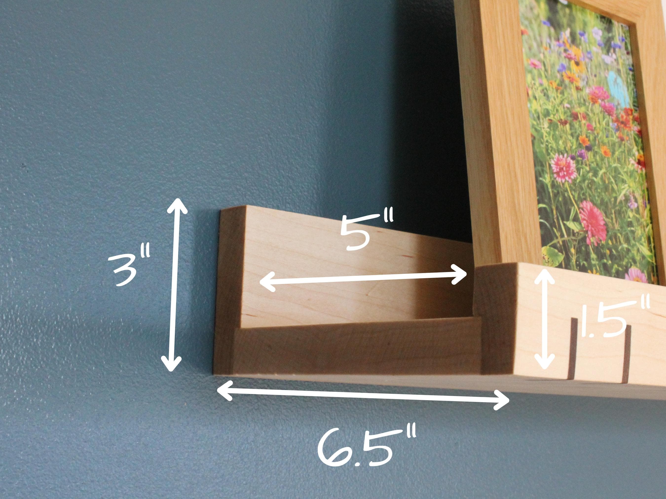 This solid wood picture frame shelf is designed for displaying frames, art, and décor with a clean, modern look. Carefully handcrafted, each shelf is sanded smooth and finished with a hard-wax coating that enhances the natural beauty of the wood grain. Installation is simple, with 16" spaced screw holes for secure mounting. We include wooden plugs to cover the openings for a seamless finish. While screws and anchors are not included, we’re happy to assist with recommendations based on your wall type. For added detail, front corner splines are available as an optional design feature. These small inlaid accents provide a subtle yet elegant contrast, highlighting the craftsmanship behind each piece. If you prefer a cleaner, uninterrupted look, the splines can be left out upon request. Available in multiple sizes, this shelf measures 1.5 inches high in the front, 3 inches high in the rear, and provides 5 inches of usable depth for display. Each piece is made to order, and custom sizes are available upon request.
