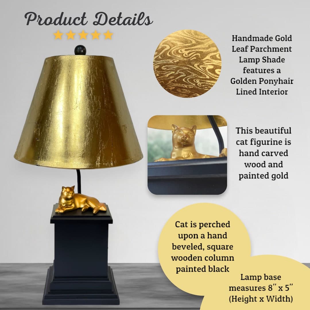This Table Lamps item by royalLAMPSHADES has 43 favorites from Etsy shoppers. Ships from Marietta, GA. Listed on Mar 20, 2025. Introducing our Cat Figurine Table Lamp – the purrrrfect blend of whimsy and kitschy for cat lovers and decor enthusiasts alike! This is a one-of-a-kind lamp designed by Royal Designs, Inc. Quantities are very limited. Get it while supplies last! This adorable table lamp features a charming cat figurine, exquisitely crafted with attention to detail, showcasing the playful nature of our feline friends. Made from high-quality wood, the figurine boasts a lifelike appearance that will captivate anyone who lays eyes on it. The lamp is delicately perched on a sturdy base, providing stability while adding an elegant touch to any surface. The lampshade is handcrafted at our store in Georgia and casts a warm and cozy glow, creating a soothing ambiance in any room. Whether you place it on your bedside table, living room sideboard, or office desk, this lamp will infuse a touch of charm and serenity into your space.