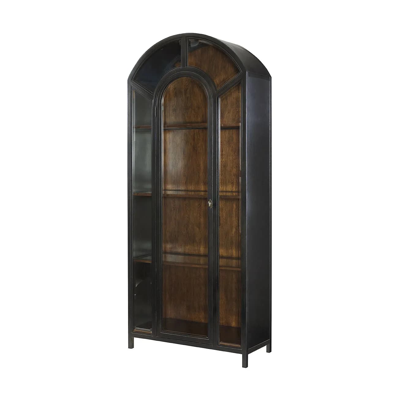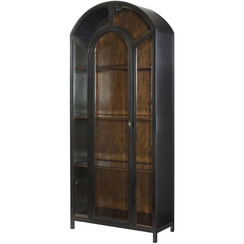 Beveled glass front door, Back panel is Cherry veneer, Side panels top are metal. Three fixed wood rimmed glass shelves. Open areas from top to bottom. The Apothecary Cabinet by Hammary Furniture may be available at Millers of Claflin in the Claflin area.