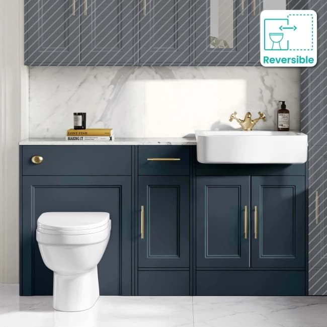(W)1500 x (D)325mm cabinet unit Delivered to you fully assembled Reversible cabinet, toilet unit and basin vanity combination High quality Inky Blue painted finish - a dark shade of matt blue Made from engineered wood Premium soft close door with brass knurled handle Durable Carrara style polymarble top board (No pre-drilled hole) Easy to maintain ceramic basin Includes concealed cistern with 3/6 litre dual flush in brushed brass finish Modern back to wall toilet with soft close seat Basin mixer tap and waste sold separately Marble tops come in natural pattern, actual product may vary slightly This is the same colour as Navy Blue. Due to different finishes, the colour of this collection may vary slightly from Navy Blue PVC. Please Note: Our units are water resistant, but not waterproof. Any excess water should be wiped dry. Failure to maintain the unit correctly, may shorten the life expectancy of the product and invalidate the warranty