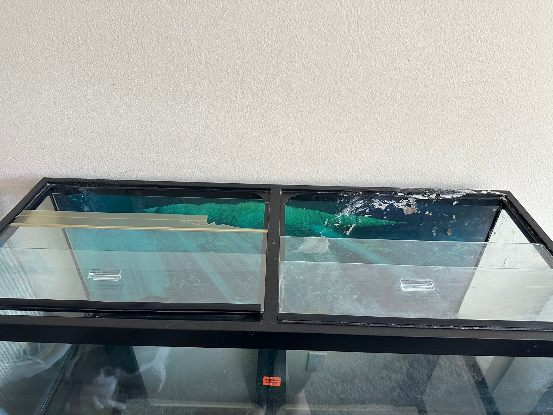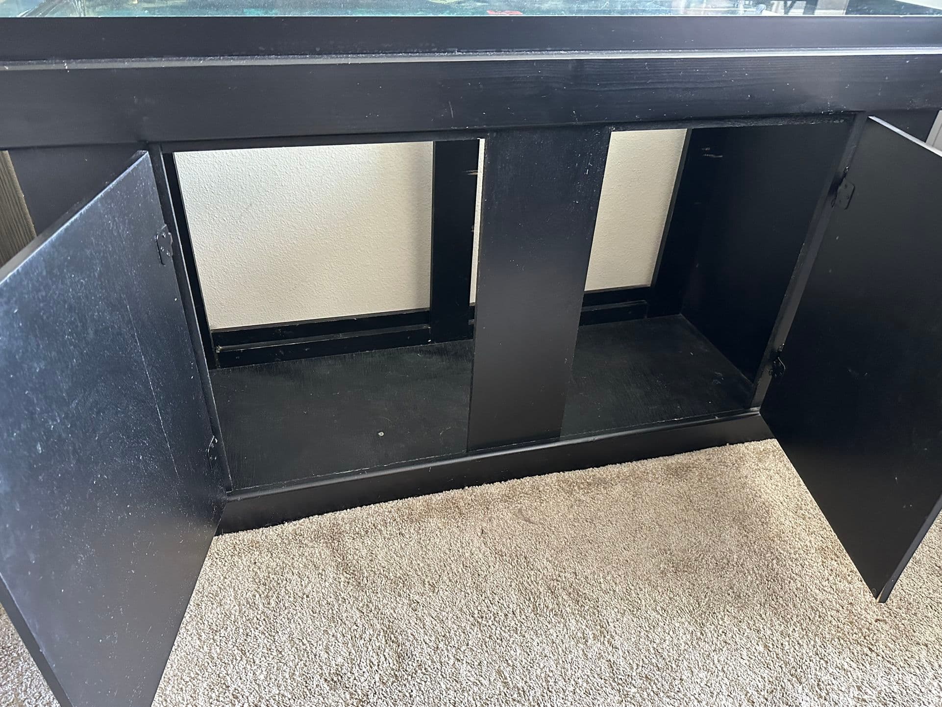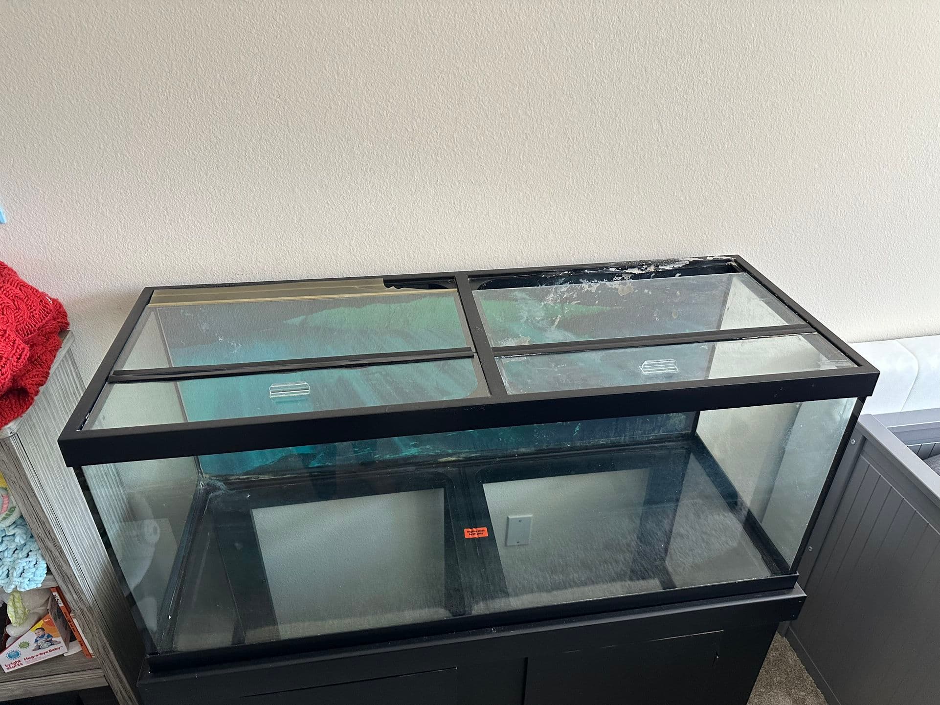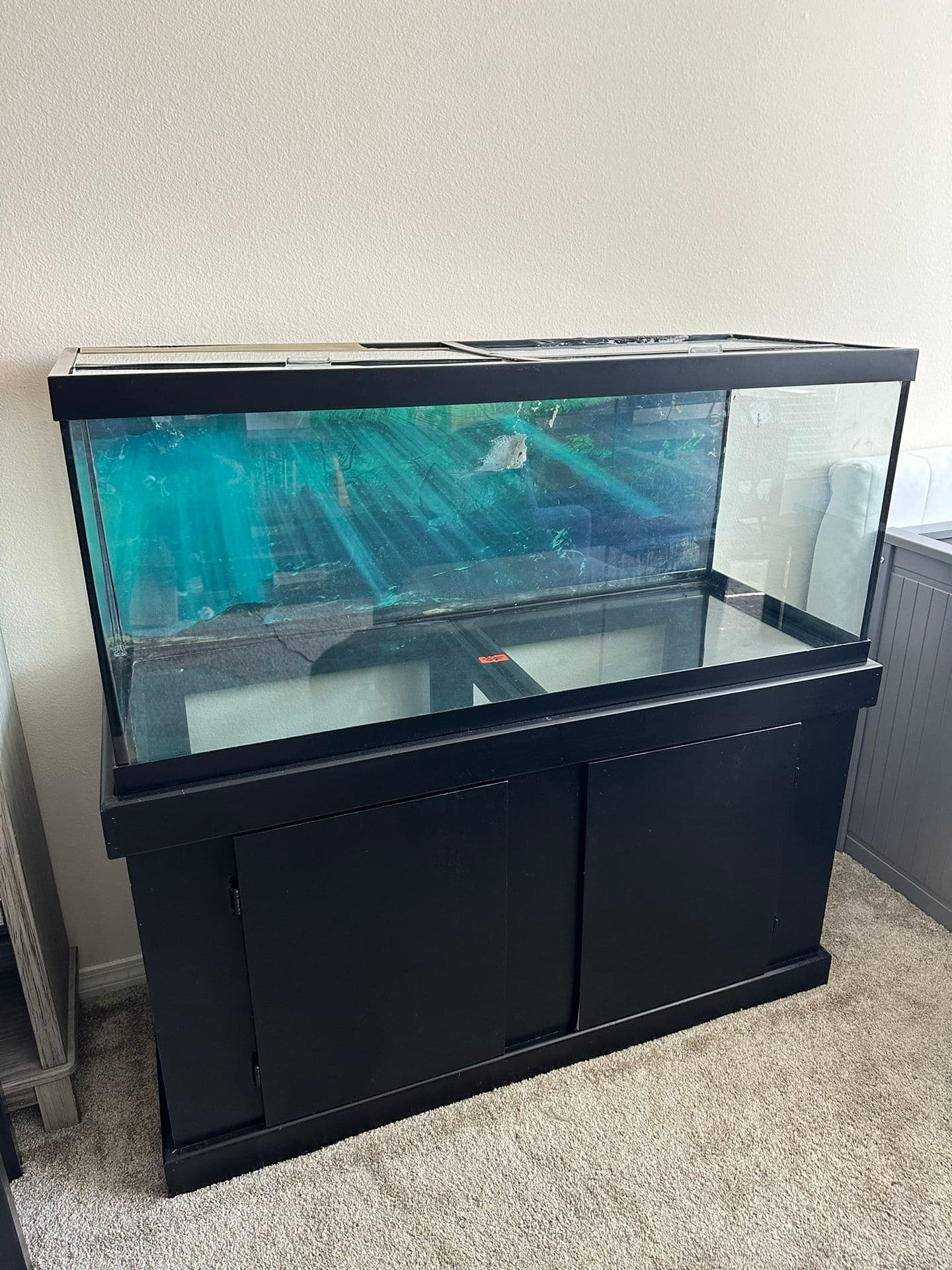 Cash only Pick up only 75 gallon tank + stand Tank: 18.5” D, 48.5” W, 21” H Stand: 20” D, 50” W, 28” H areas of scaling and melted top rim from light sitting too close.
