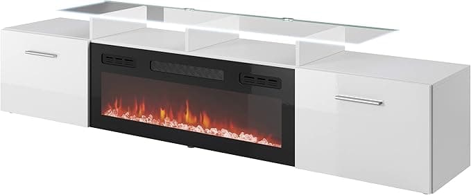 Mirjan24 Rozion TV Cabinet with Electric Fireplace, Realistic LED Flame, with Decorative Crystals, Electric Fireplace with Heating, TV Lowboard (White/White High Gloss, without Lighting)