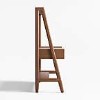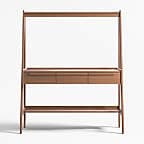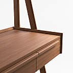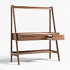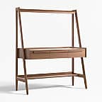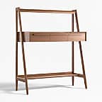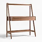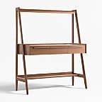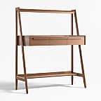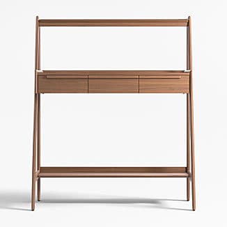Our 1960s-inspired Tate standing desk recalls the timelessness of mid-century design while responding to how we work today. Crafted with beautiful walnut veneer, the desk allows you to choose the desired height of your work surface—from sitting to standing with three heights in between. The desk has an open feel, featuring shelves above and below the work surface, slim legs and three drawers united by linear undercut drawer pulls. Offering great flexibility with a space-conscious footprint, our Tate standing desk is a Crate & Barrel exclusive.