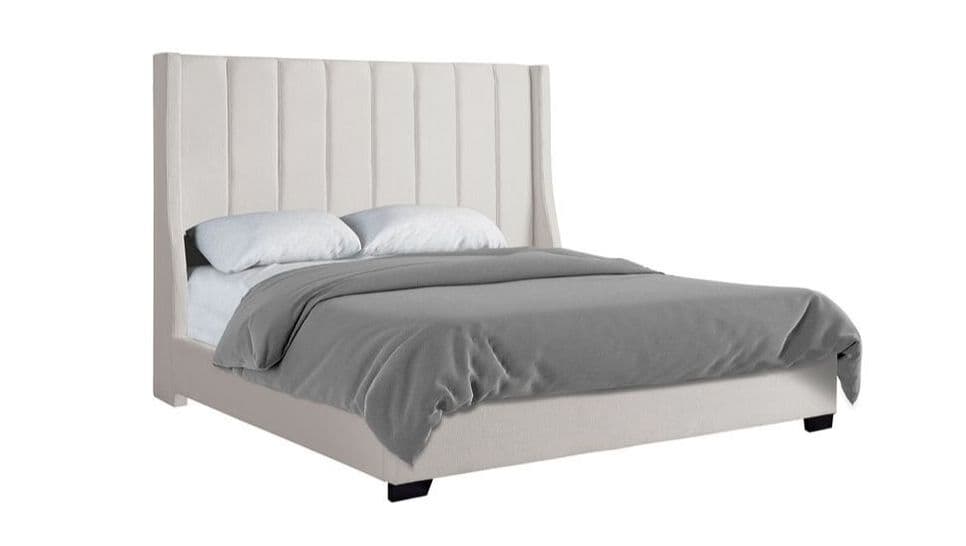 This product is not currently on display in-store. It is available for delivery within 5-10 days of purchase. Call for more information. Description: This line-tufted bed is a perfect match for any modern room. The bed is off-white and available in King and Queen sizes.
