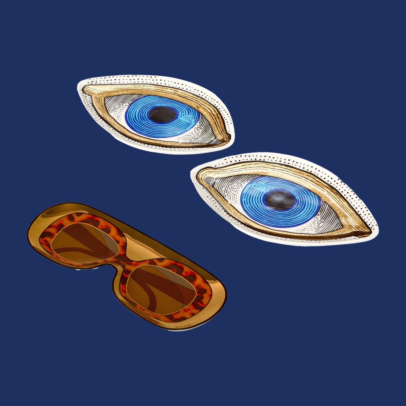 Crafted from porcelain and lined in gold, these eye-catching baby blue trays add style to any setting. The Eye Trinket Tray Set is ideal for organizing small items, and the Shades Trinket Tray is perfect for a bedside table, bathroom counter, or any surface. Presented in a gift box, they make an excellent hostess gift or a treat for yourself. The set includes two Eye Trinket Trays and one Shades Trinket Tray. Bundles do not qualify for additional discounts.