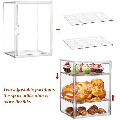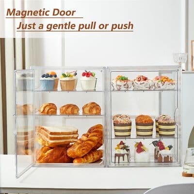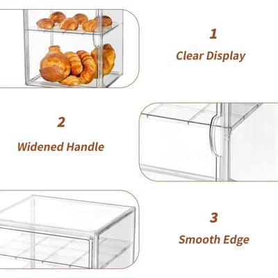 Clear Pastry Display Design: The bakery display case is made of food-grade acrylic material, allowing you to directly see the bread inside at a glance, which is beautiful and convenient. With its fully enclosed design, dirt will no longer be able to reach your food.