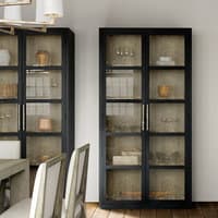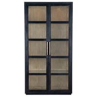 With the aura of a rustic mountain cottage, the Linville Falls Curio Cabinet has two wood-framed doors with seeded glass inserts. Crafted of Pine Veneers, the cabinet has a charred black finish achieved through Shou Sugi Ban, a Japanese technique that creates a look resembling burnt wood. The interior is finished in Mink, a soft smoked gray. There are three adjustable wood-framed glass shelves, one fixed wood-framed glass shelf, and two puck lights in the top with a three-intensity touch switch on the right side back panel. Textured metal bar pulls have an antique pewter finish.