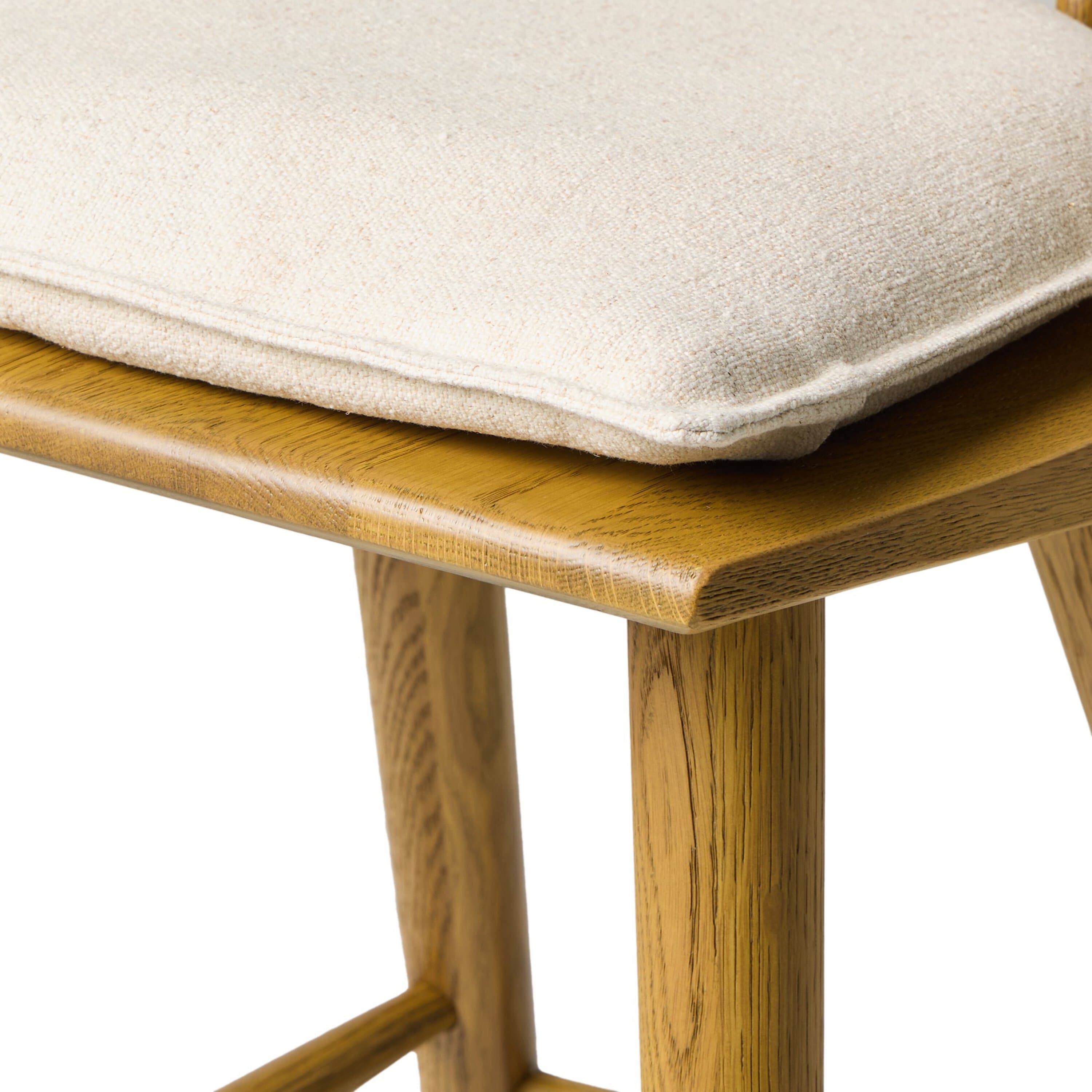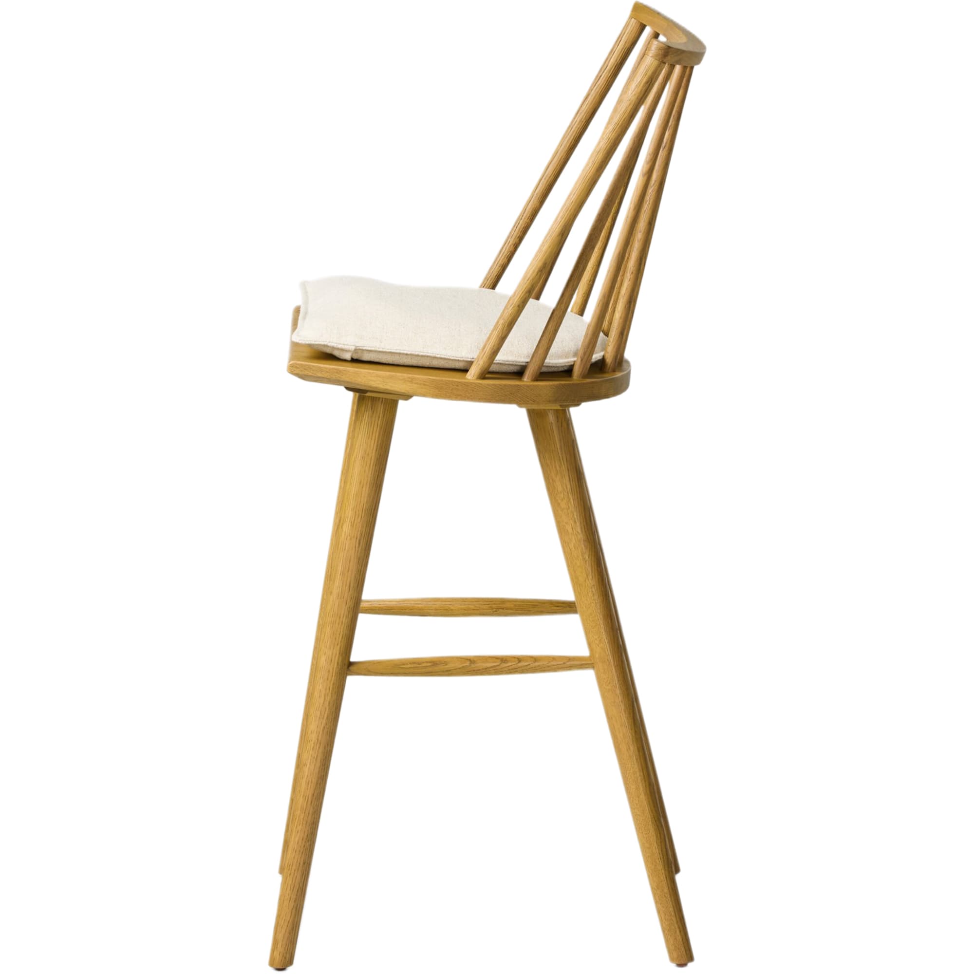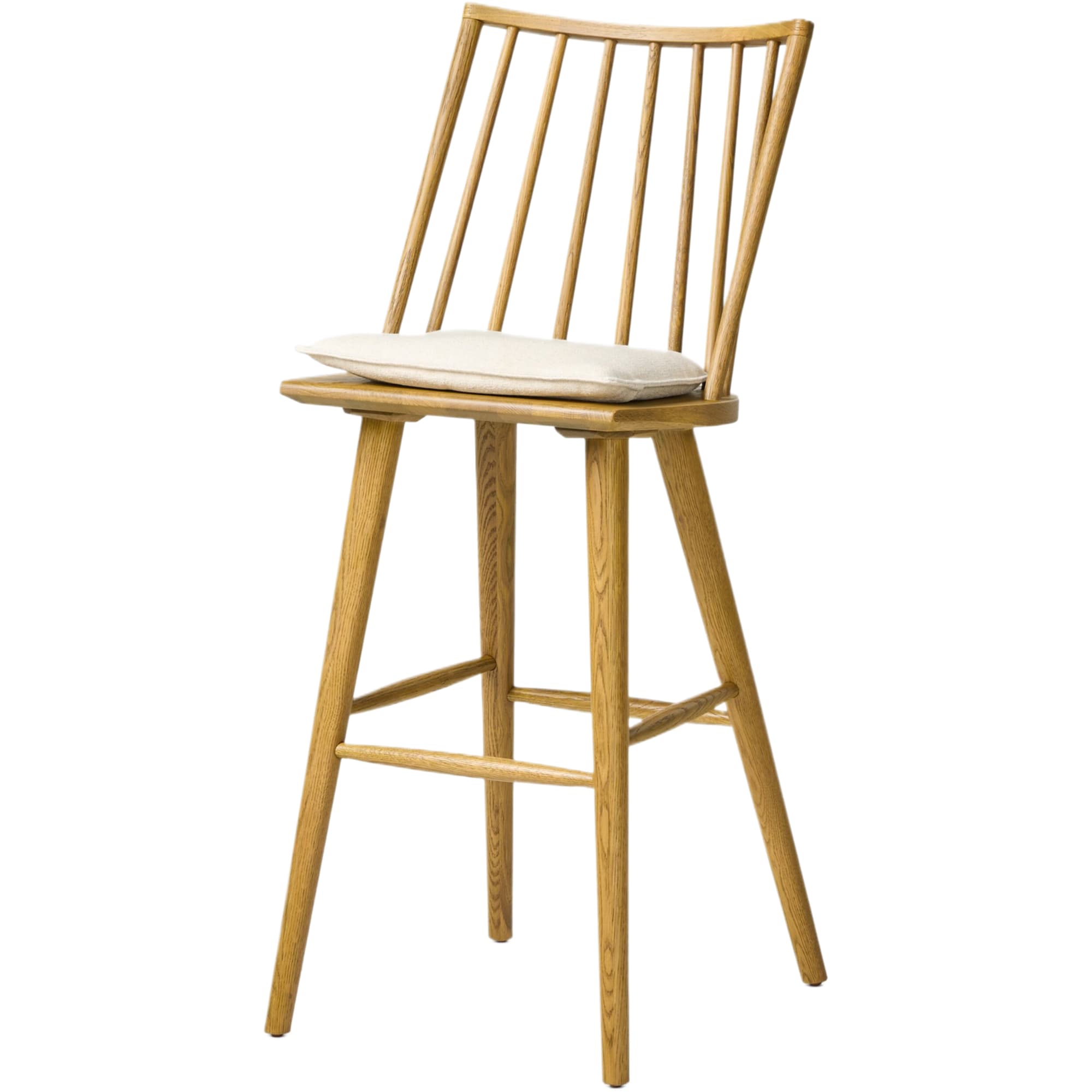 - Antwerp Natural, a modern reinterpretation of the classic Windsor design. This tall and elegant stool is meticulously wire-brushed to accentuate the natural cathedral graining of oak, offering a sophisticated yet contemporary aesthetic. The addition of a loose seat cushion provides a delightful contrast and ensures comfort, making it an ideal choice for any bar or counter setting. Experience the perfect blend of tradition and modernity with this exquisite piece.