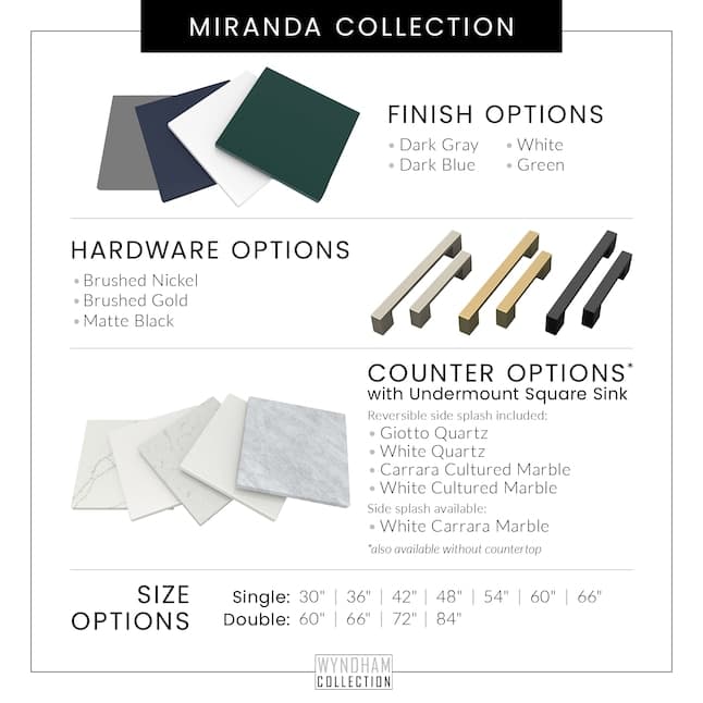 Sleek and chic are the best words to describe this European shaker vanity, a piece that bridges modern and contemporary. The Miranda vanity is manufactured in high-quality durable materials and finished to the exacting standards you've come to expect from the Wyndham Collection. With function as important as form, the elegant design focuses on ample storage and counter space, a choice of several different handle colors, and 3D adjustable soft-close doors and dovetail drawers.