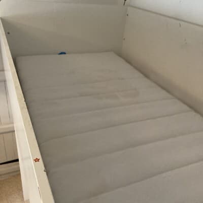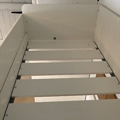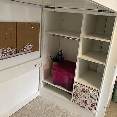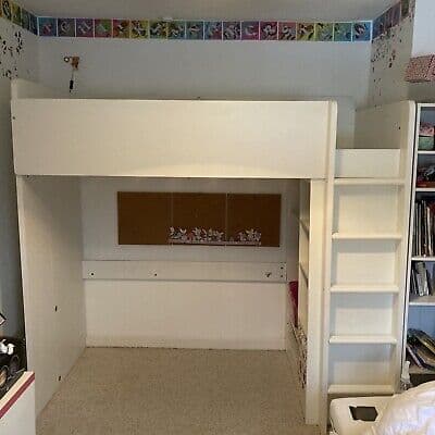 This Ikea STUVA/SMASTAD Loft Bed is made of wood in white colour. It features a built-in wardrobe and shelves, perfect for a child's bedroom. The bed comes with a single mattress included if desired. The bed is in good condition. There are one or 2 scratches/marks in the bunk area- see photos. There is an Ikea foam mattress that the buyer can have which has a washable cover. I would prefer it if the buyer comes and dismantles it themselves or I can dismantle it for a fee. Collection only from Glastonbury.