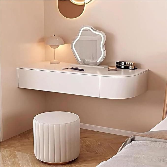 Wall - mounted and height - adjustable, suitable for small rooms, keeps space clutter - free. Wood - made, sturdy, easy to clean. Drawer has silent rails for smooth use. Large drawer stores makeup, tools. Open desktop for daily items, all close at hand. Works as makeup, work, nightstand, salon station, adds function and style. Friendly Reminder: 1. Please confirm size and style before purchasing. 2. Mirrors are not included, stool are not included. 3. The size is measured manually, there may be a slight difference of 1-2 inches. Product Size: Length: 23.6/31.5in (60/80cm) Width: 15.7in/40cm Height: 7.1in/16cm.