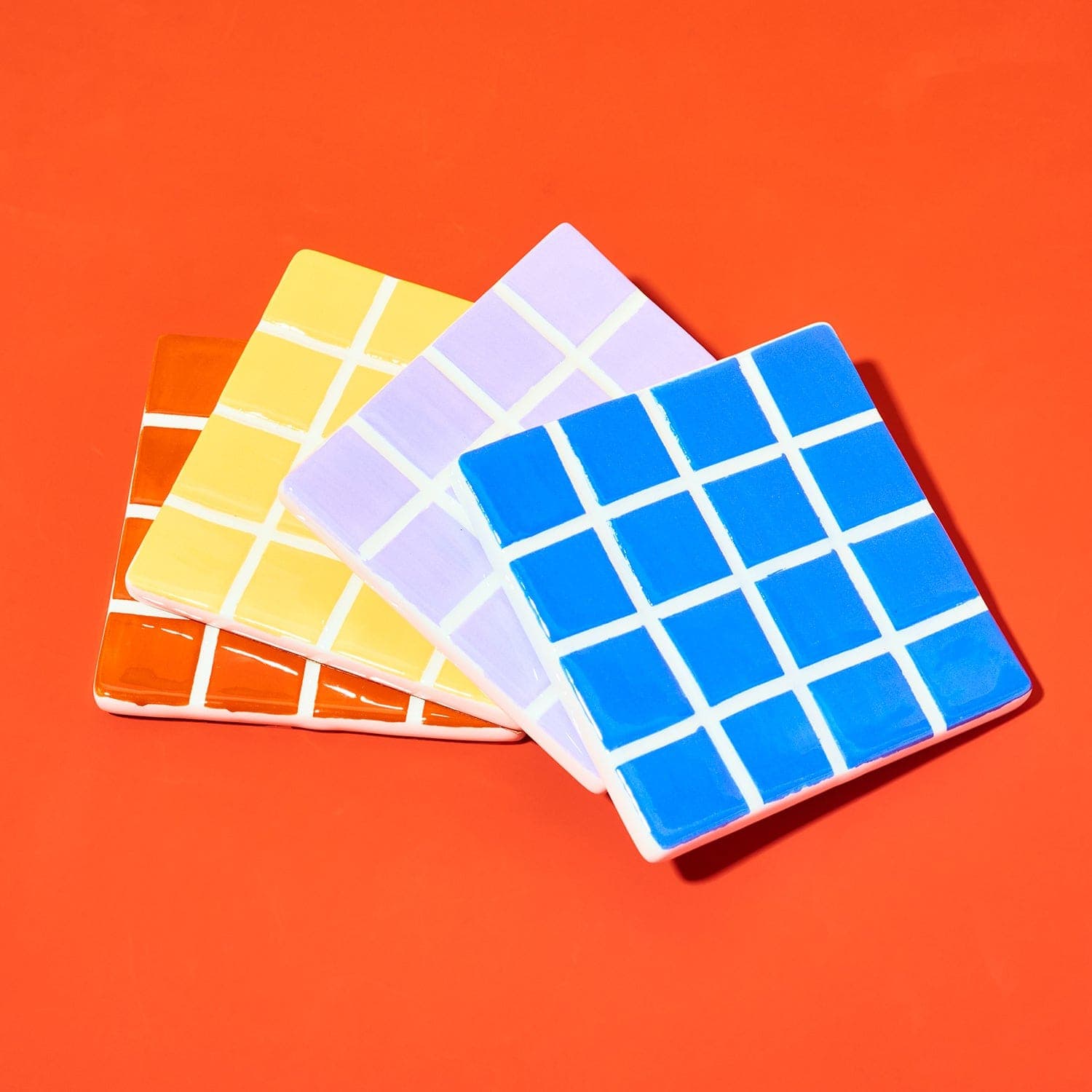 Check out our Colored Tile Coasters Set ✨ Your table will thank you for the upgrade! 3.5 x 3.5 x 0.25 / Set of 4. Hand wash only. Dolomite. Imported.