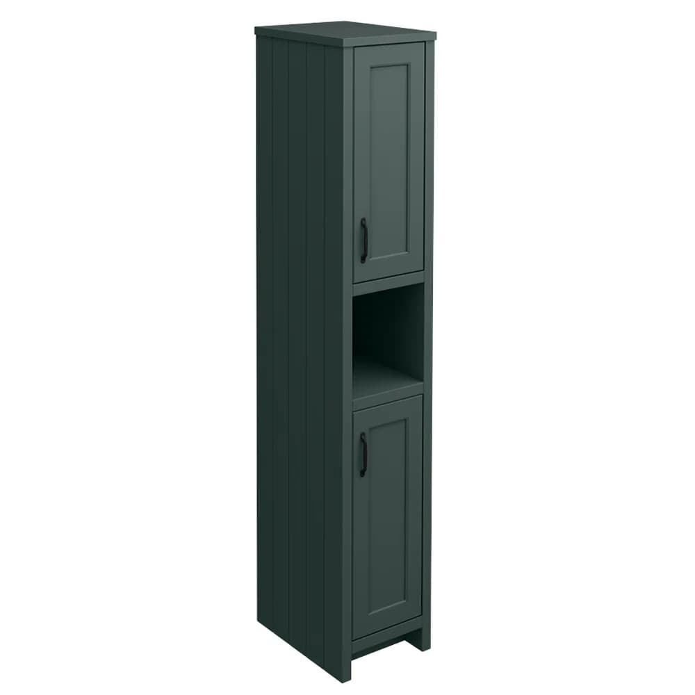 The Chatsworth traditional tall bathroom cabinet, Victorian inspired design with a modern twist. The Chatsworth range of charming bathroom furniture features classic styling with a satin green finish and tongue-and-groove side panelling. The soft-close function of the doors means no slamming and the cupboard boasts sturdy matt black handles. Internal and open shelves provide generous storage space for your toiletries, helping to keep your bathroom clutter free. Manufactured to a high standard, the inspired Chatsworth range of luxury furniture with it's clean minimalist design and muted palette blends beautifully with any style of bathroom.