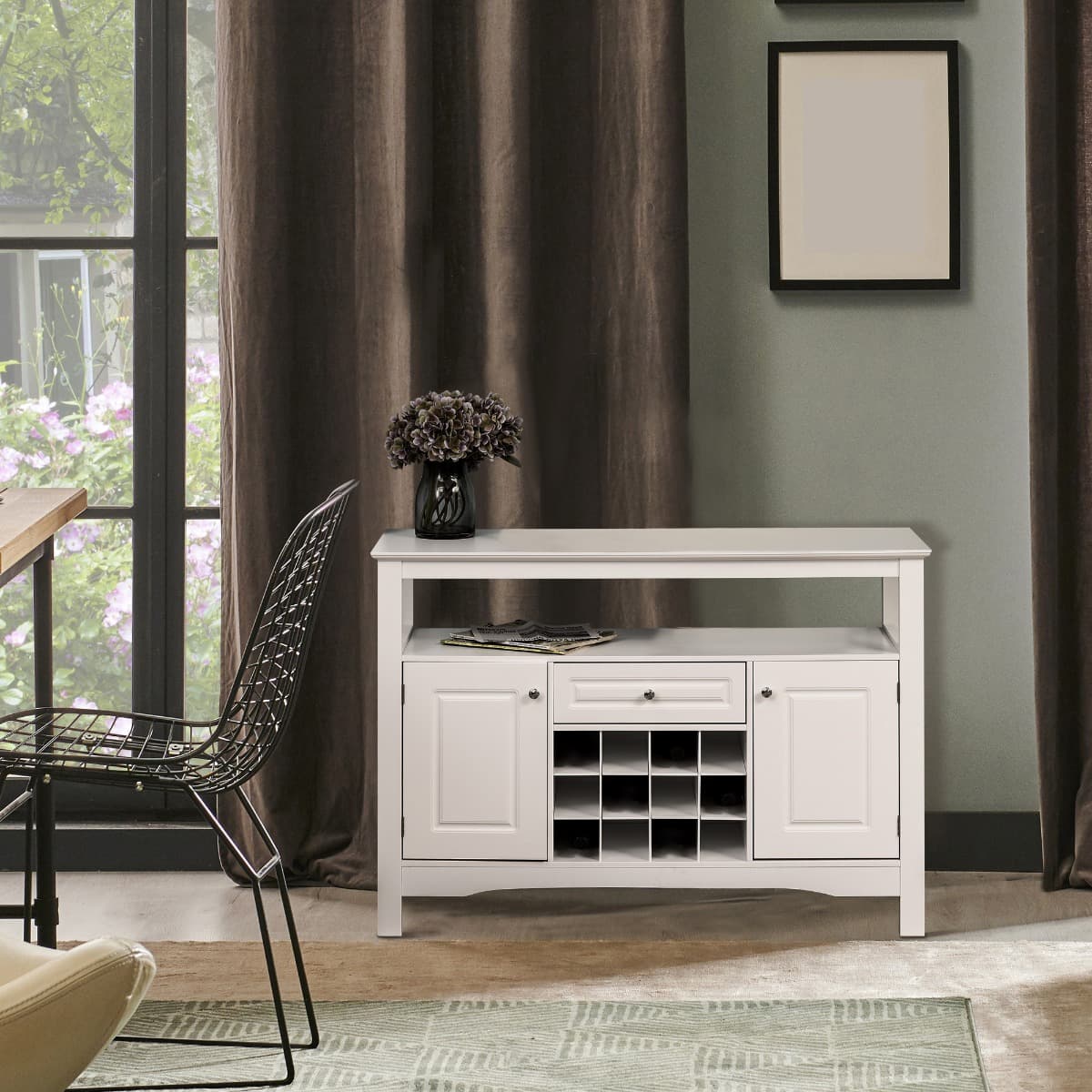 Looking to unwind with a drink or two? Choose a bottle from this versatile bar cabinet. Doubling as a buffet table, it features a spacious countertop, an open shelf, a utility drawer, two concealed cabinets, and a 12-grid wine rack, providing abundant storage for your wine collection. Its sleek design and neutral colors complement most home decor.
