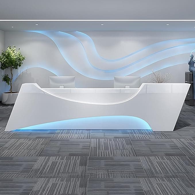 This receptionist desk features a sleek, modern design that exudes elegance and professionalism. With its pre-assembled structure, this small reception desk saves time and effort, making it perfect for any modern reception desk setup. The hidden LED lighting along the front desk reception counter provides a soft glow that enhances the overall aesthetic, creating a welcoming and visually appealing atmosphere for any office reception desk. Crafted from high-quality solid wood and finished with piano lacquer, this reception counter is built for longevity while offering a luxurious appearance that complements any front office desk environment. Designed with convenience in mind, this office reception desk includes a lockable drawer, keyboard tray, and silent hinges for smooth operation. This modern reception desk is perfect for various settings, from corporate offices to retail spaces.