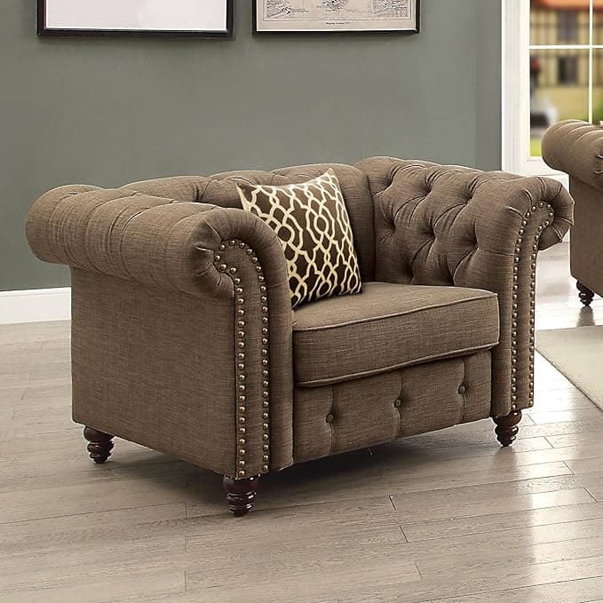 Brown Tufted Accent Chair with Decorative Pillow, Elegant Design, Structured Comfort