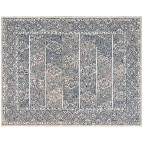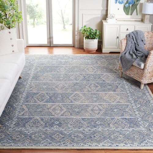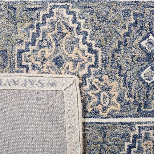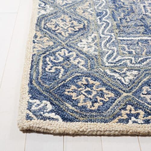 Elevate your living space with the enchanting charm of our 3' x 5' hand-tufted wool area rug. Artisan-crafted in India, this rug embodies the soul of Bohemian elegance, combined with the comfort of a plush 3/8" pile height. The harmonious blue and beige palette complements the intricate patterns, inspired by traditional designs, adding a touch of time-honored sophistication to any room. Perfect for smaller spaces, this small rectangle-shaped treasure will infuse your home with its cosmopolitan yet homey vibe, making it an irresistible addition to your decor collection.