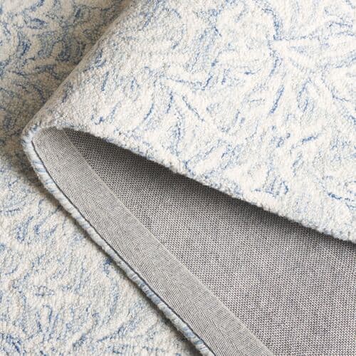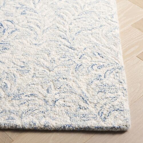 Elevate your home decor with this elegant area rug, sized at 3 feet by 5 feet, perfect for adding a touch of sophistication to any room. The rug features a beautiful blend of blue and ivory hues, creating a serene ambiance. Its small rectangular shape and low profile height of 3/8 inch make it a versatile addition to your space. Crafted using the hand tufted technique, this rug boasts a wool pile that offers a soft and inviting texture underfoot. Originating from India, it embodies a traditional style with its intricate floral flower pattern, resonating a classic charm and timelessness. This rug effortlessly combines style and comfort, making it a delightful choice for any living area. Transform your interiors and create a welcoming atmosphere with this graceful decorative piece.