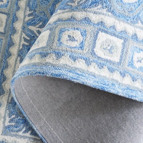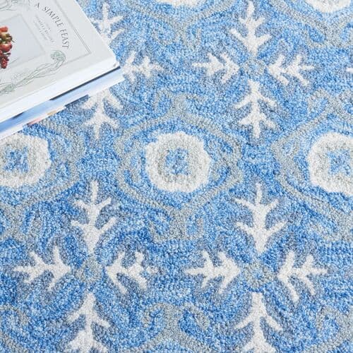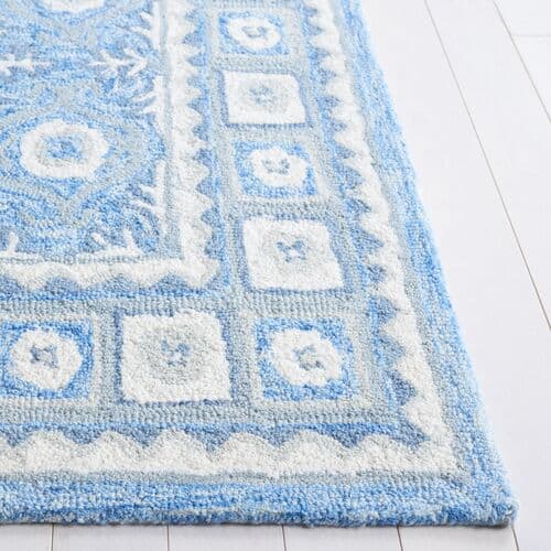 Transform your living space with the elegance and charm of this large rectangle area rug, size 10 feet by 14 feet, boasting a timeless blue and ivory color palette. The design features an intricate pattern of floral motifs and geometrical shapes, creating a harmonious blend of traditional and contemporary aesthetics. The rug's height stands at a comfortable 3/8 inch, perfect for underfoot comfort without compromising on style. Each rug is meticulously hand tufted, a craftsman technique that ensures durability and adds a unique touch to each piece. The blend of 80% wool and 20% cotton guarantees a soft texture that is both warm and resilient, making it an ideal choice for any area of your home. Crafted in India, this rug not only brings with it the heritage of one of the world's most renowned rug-making regions but also a promise of quality and meticulous attention to detail. The combination of luxurious materials and exquisite design makes this rug a must-have for those who seek to add a touch of sophistication to their decor.