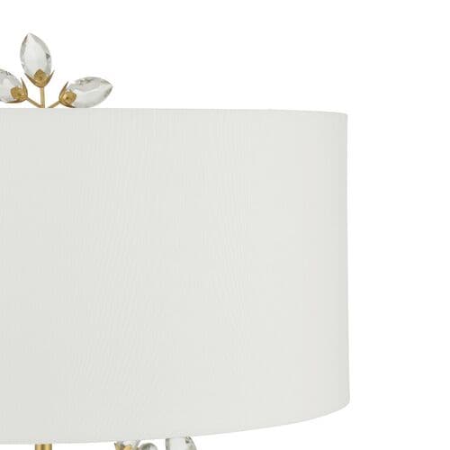 The Forget-Me-Not Floor Lamp is a stunning blend of luxury and artistry. A radiant leaf finish adds a touch of opulence while shimmering flowers crafted from crystals flow up from the thin stem toward the shade for an elegant, nature-inspired design. The two-light floor lamp has a drum shade that is fastened with a gleaming crystal finial.