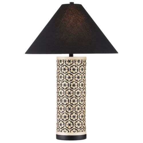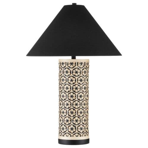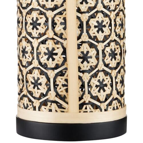 The Nebulon Table Lamp features a columnar body wrapped in handwoven bamboo, showcasing a traditional Vietnamese star-weaving pattern passed down through generations. Crafted from a mix of natural and black-dyed bamboo, each lamp carries slight variations that highlight its handmade character. A black empire shade deepens the visual impact, echoing the woven motifs, while metal hardware and a sleek base complete the design with a subtle, modern contrast.