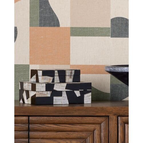 The Bindu Box Set is a modernist-inspired accent for any space. Made of pieces of composite and buffalo horn, which is chiseled to bring the surface added texture, the decorative boxes make a statement wherever they are placed. The interiors are lined with linen, and both large and small boxes have a felt bottom to complete the feeling of fine detailing.