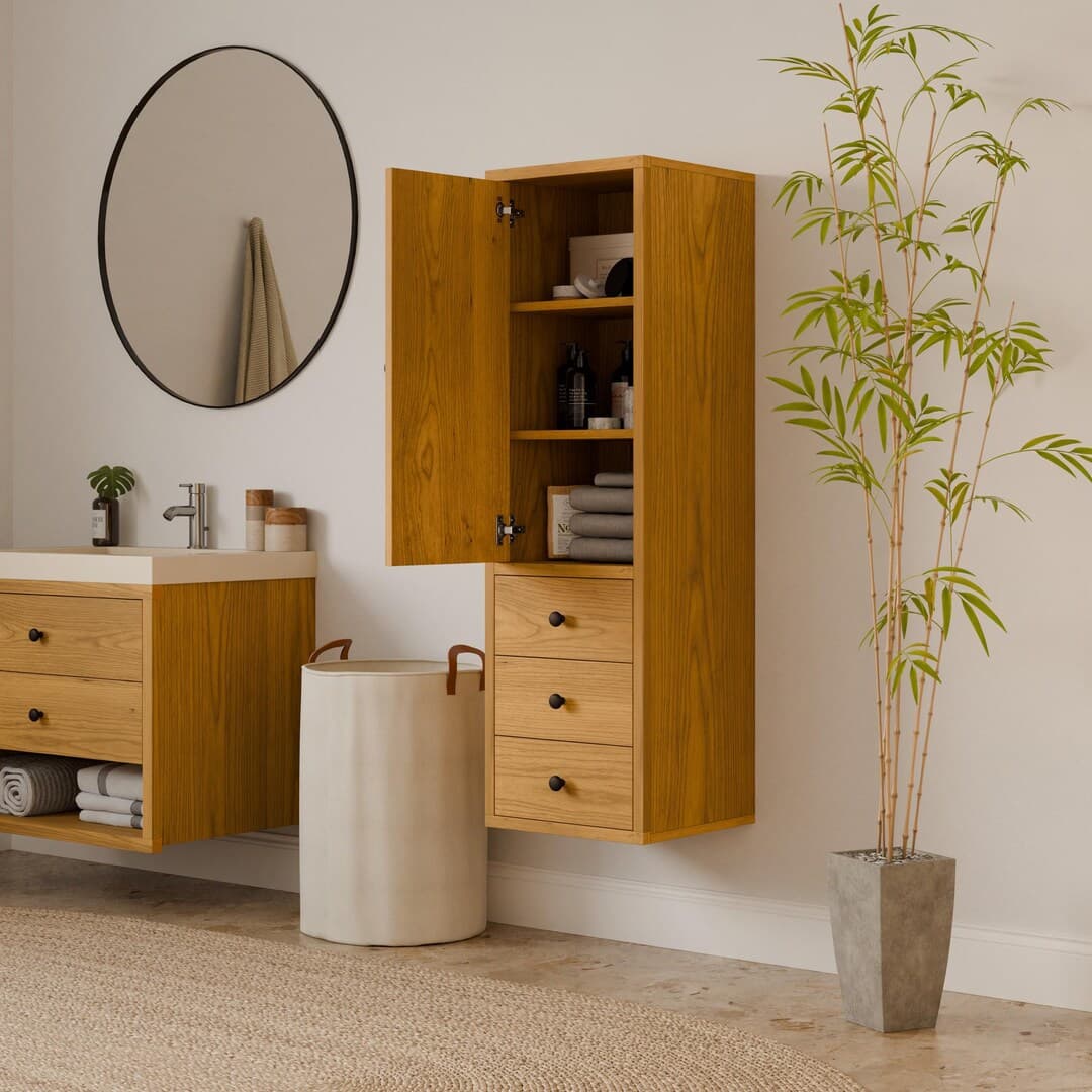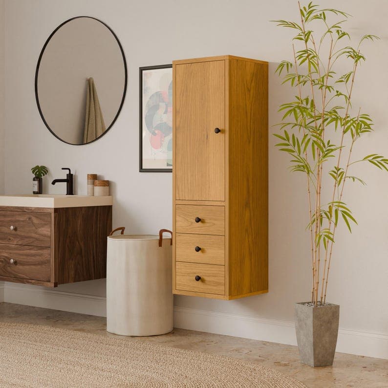 Cherry Bathroom Linen Storage Cabinet with 3 Drawers, Tall
