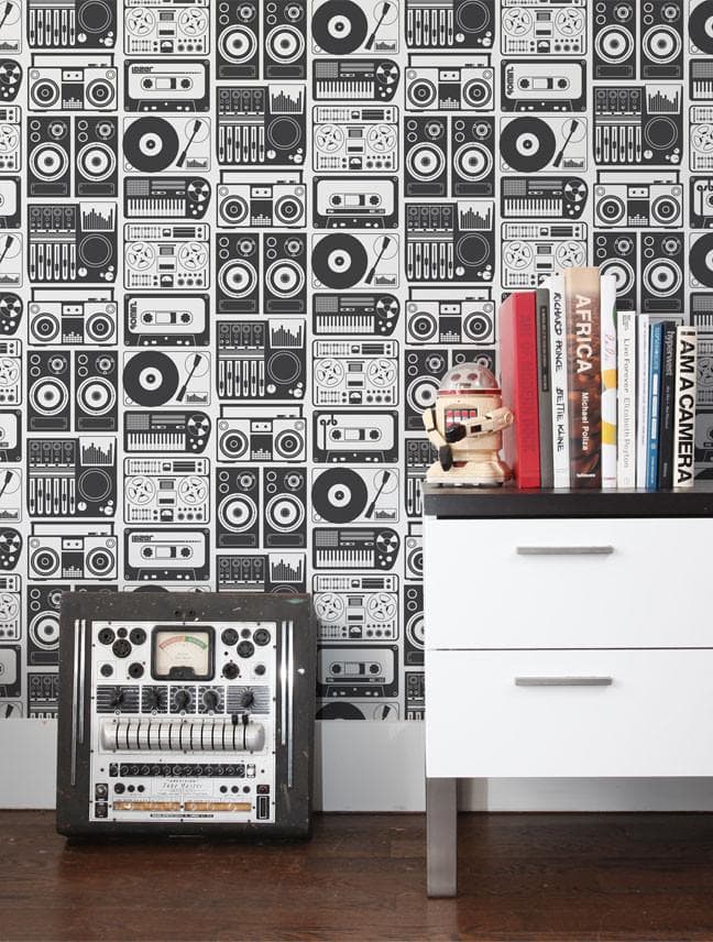 Aimee Wilder's designer wallpaper is generally printed upon order. Please allow up to 10-16 weeks to ship out and receive tracking. Note: Once an order has been submitted, it cannot be cancelled. Analog Nights Designer Wallpaper by AimeeWilder. This best-selling graphic wallpaper is the perfect decor for kids, adult, your home or business. Digital pigment print Measurements: 27 inches wide x 5 yards long per single roll Design Repeat:33.5 inches Design Match: Half Drop Main Element Size: 1 Boombox measures 6.5 inches wide. Smaller orders (generally under 10 rolls) come untrimmed. Aimee Wilder draws her inspiration from contemporary graphic art and the design world. Influences include typography, logo design, illustration, textiles, urban toy design, rock poster art. Aimee's current projects include designs for home textiles and accessories, fashion and print. Please note: Burke Decor does not accept wallpaper returns at this time. Why? Wallpaper is produced in batches (similar to tile) and due to dye-lot variations that occur based on when the rolls are produced, we are unable to accept returns. *This item is excluded from sale events and not available for additional discounting or promotional offers.